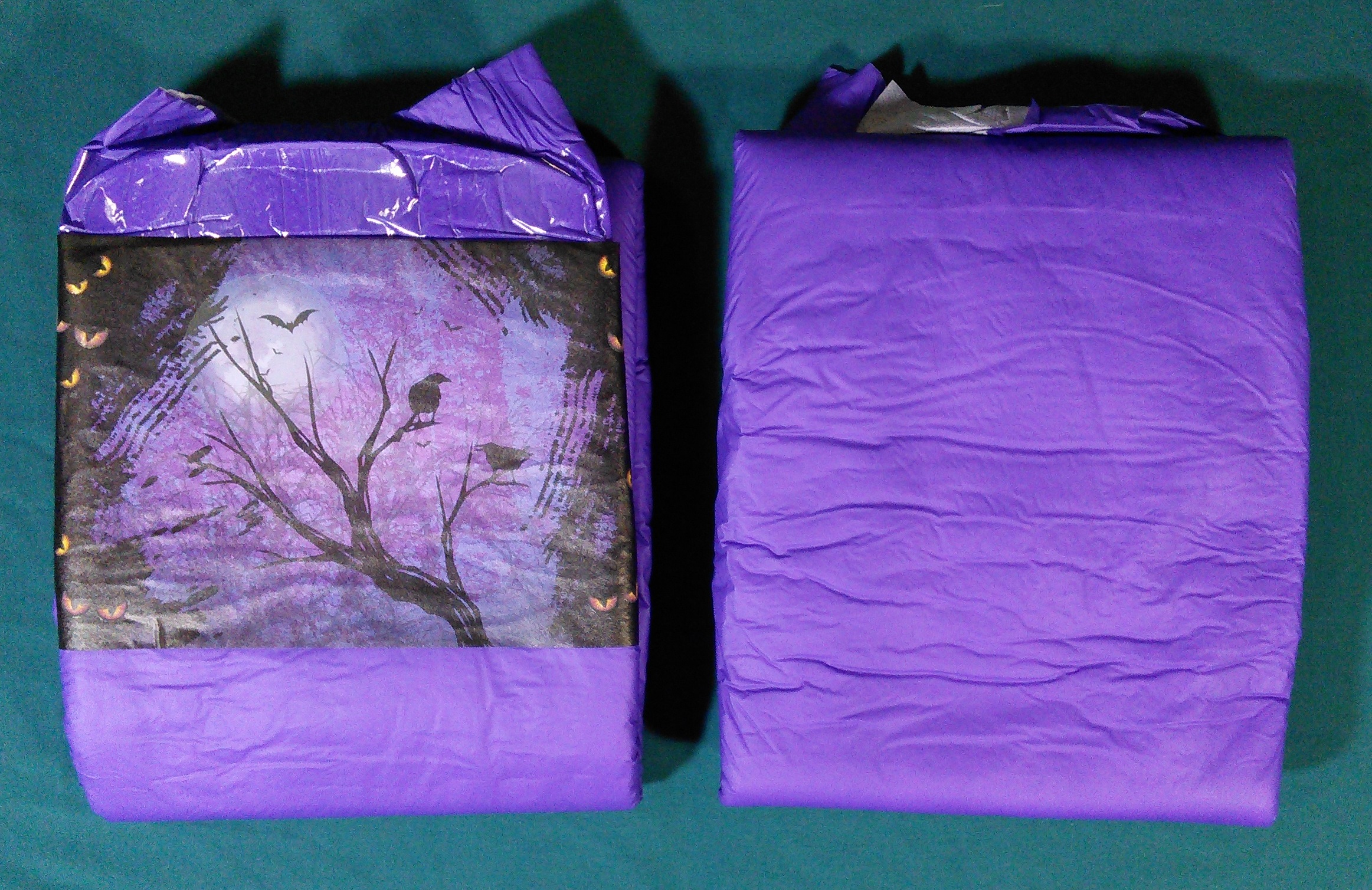 Purple plastic brief with a glow-in-the-dark haunted woods scene on the front: bats, ravens, eyes, dead tree, moon.