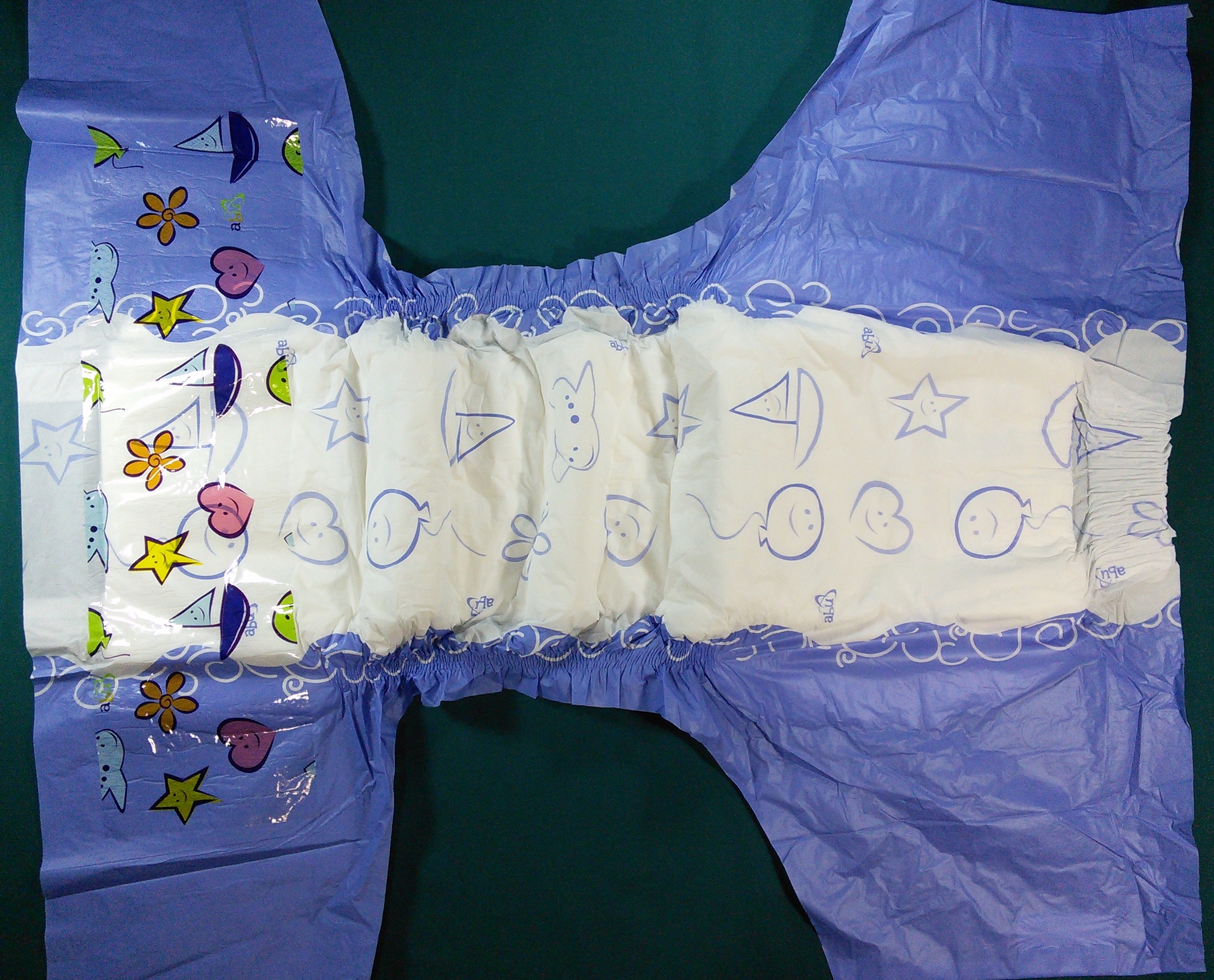 White plastic brief with baby blue teddy bears with hearts that say “happy”, kittens, poodles, clouds, trees, crowns, and “www.buntewindel.de”. Pink and blue stars. Pink flowers. The wings are plain white. Running down either side of the center panel is a broad wavy baby blue band with darker blue stripes and dashes.