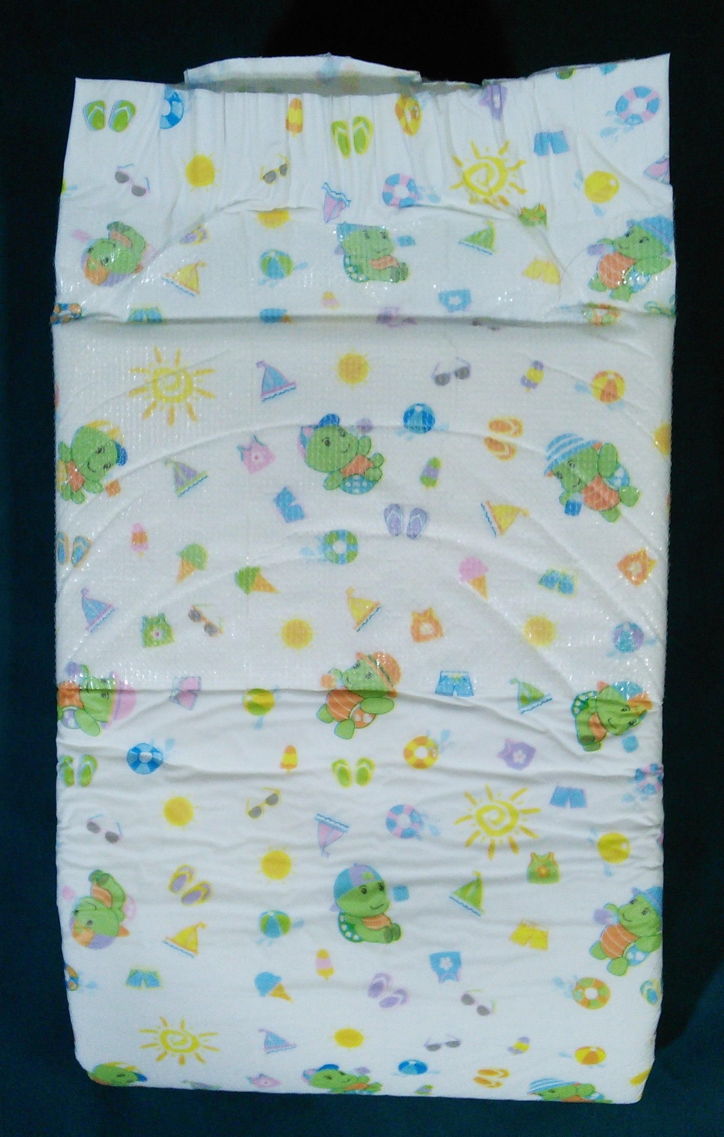 White plastic brief with all-over pattern of little green creatures with baseball hats, beach balls, sandals, sailboats, life preservers, etc. Stretchy wings and velcro tapes like the Bianco Ultrastretch and the Magnifico.