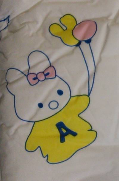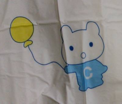 White plastic brief with bears, balloons, hearts, flowers, and windmills; rough landing zone and velcro tapes.