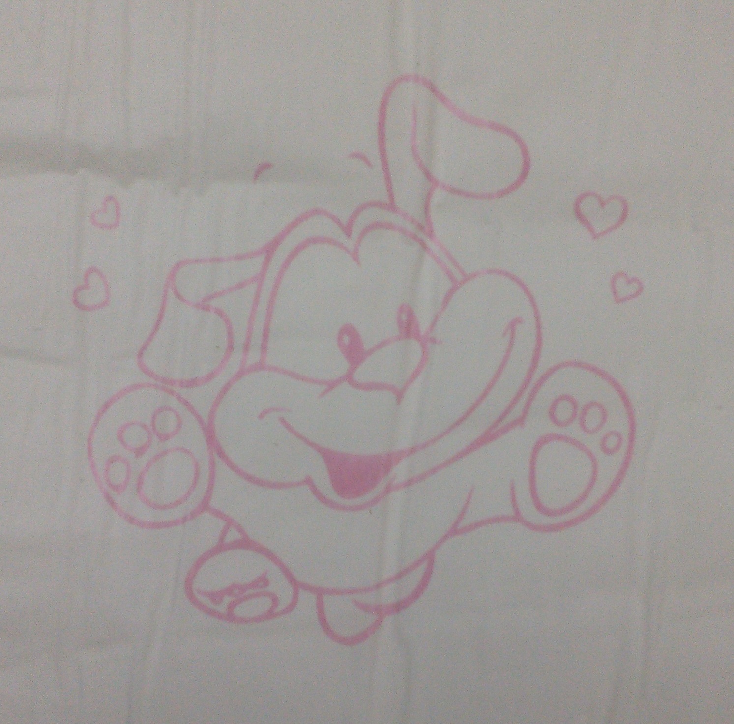 White plastic brief with pink mice, puppies, snails, elephants, and bees; and blue spirals, clouds, and hearts. Broad pink and blue waves along the sides. Blue and white gingham pattern on the wings. The padding has circular bumps in a hex pattern.