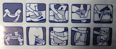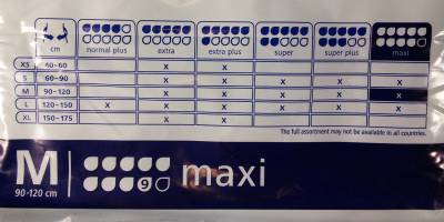 Light blue plastic brief with “MOLICARE SLIP MAXI”. Pairs of dark blue stripes.