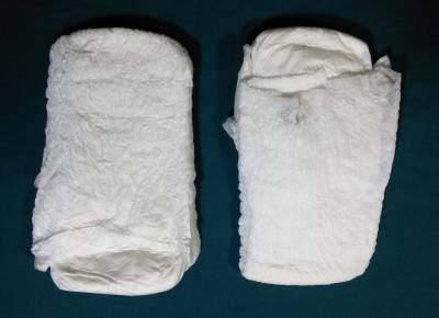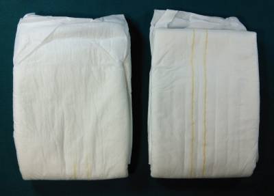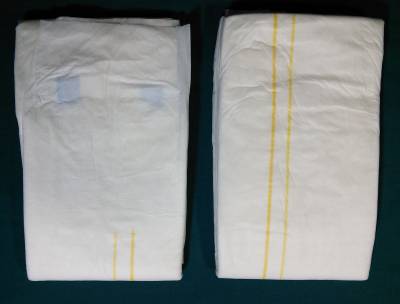 White cloth brief with two thin yellow stripes; white velcro tapes with blue tips.