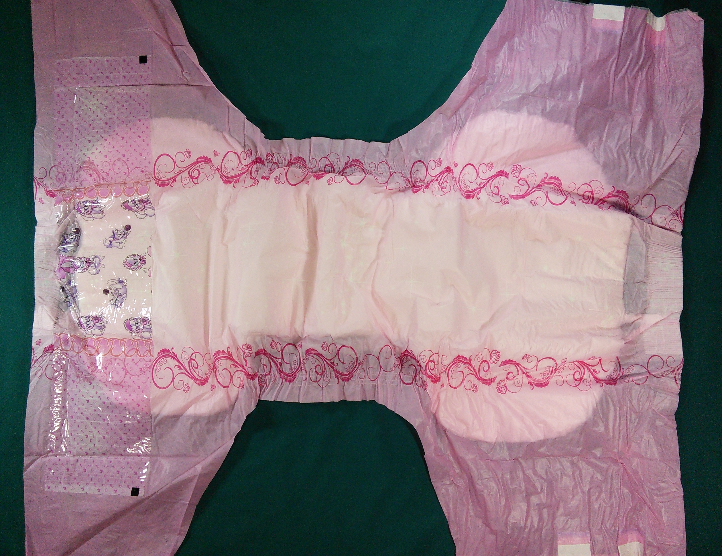 Light pink plastic brief with white stars and a dark pink swirly vine pattern running down the sides and through the leg gathers. The landing zone has puppies in baby bonnets and kittens playing with balls of twine, with left and right borders made of hearts and the sides of the landing zone filled with a pattern of tiny icons including hearts, rattles, diaper pins, and ducks.