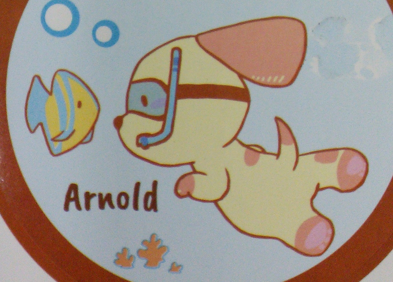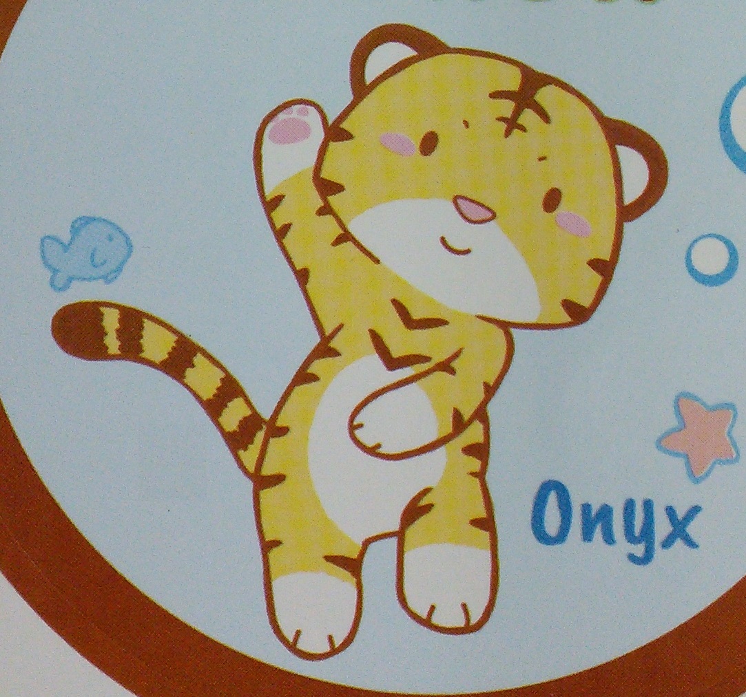 Light blue plastic brief with darker blue wings and leg gathers. Yellow bunnies, tigers, puppies, and bears. Pink otters with floaties. “REARZ” in blue.