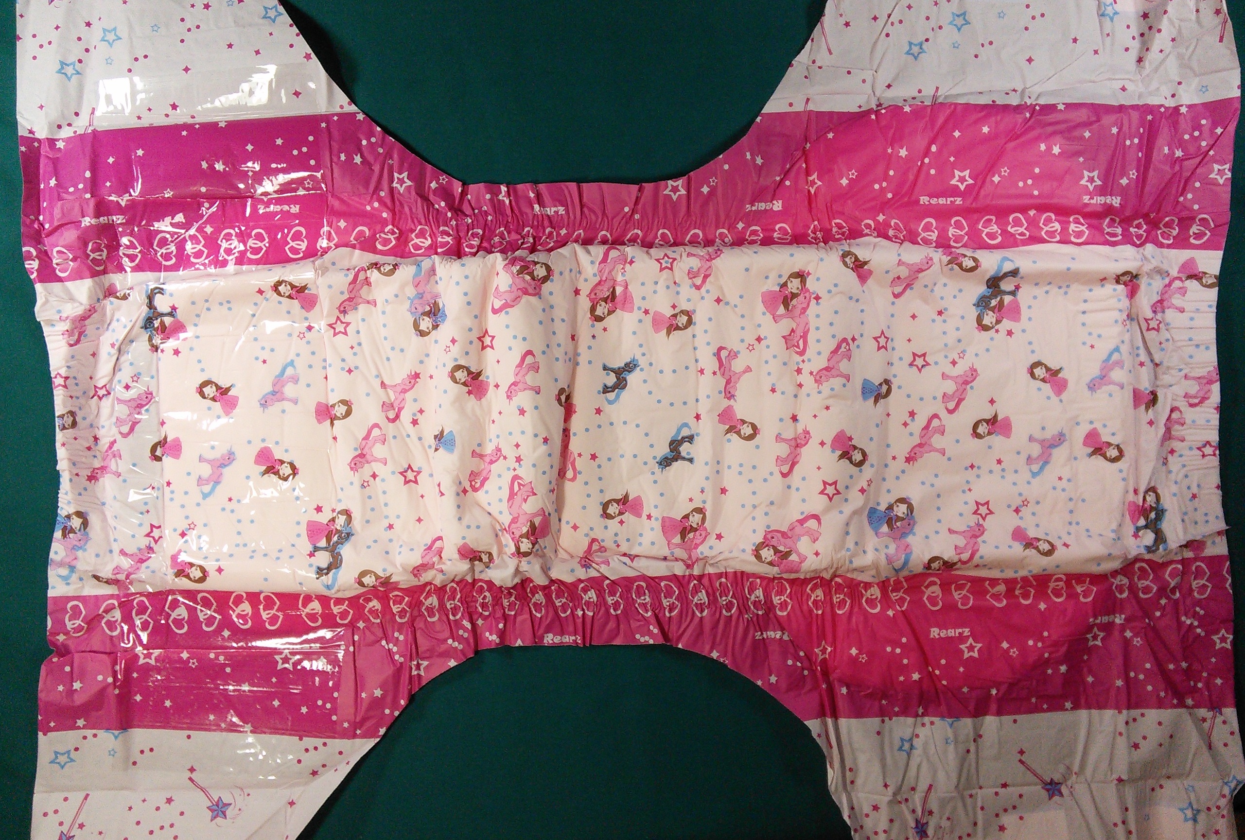 White plastic brief with princesses and unicorns. Large dark pink panels on wings and leg gathers.