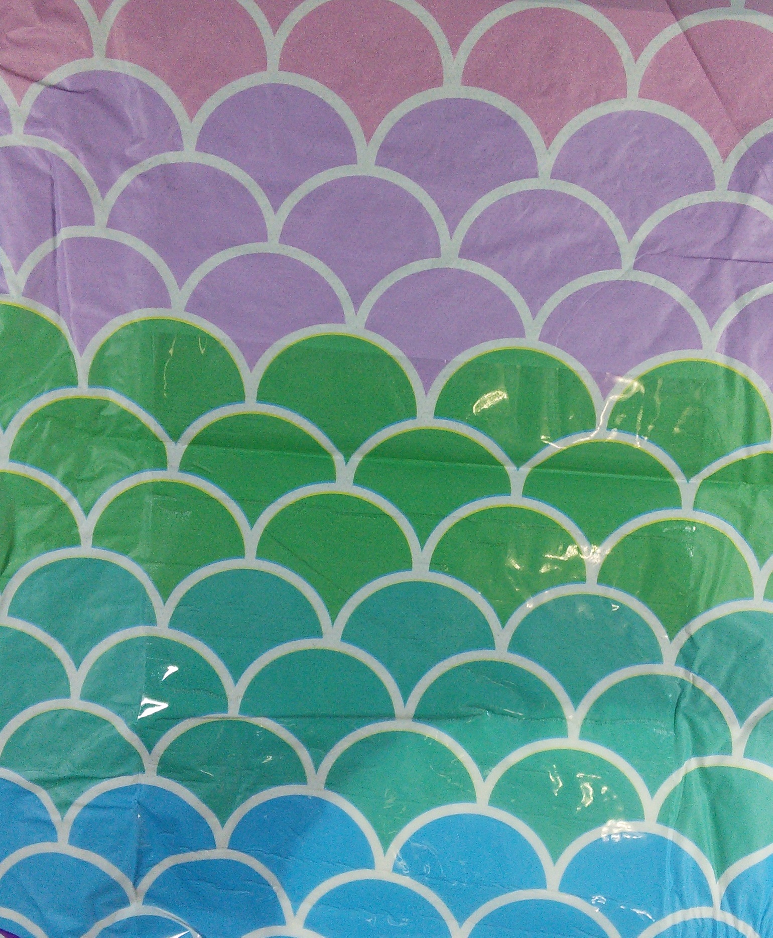 White plastic brief with mermaids, seahorses, seashells, starfish, and bubbles. The wings and gathers have a scaled pattern running from blue through green and purple to violet. Between the main panel and the wings is a thick purple stripe filled with white circles.