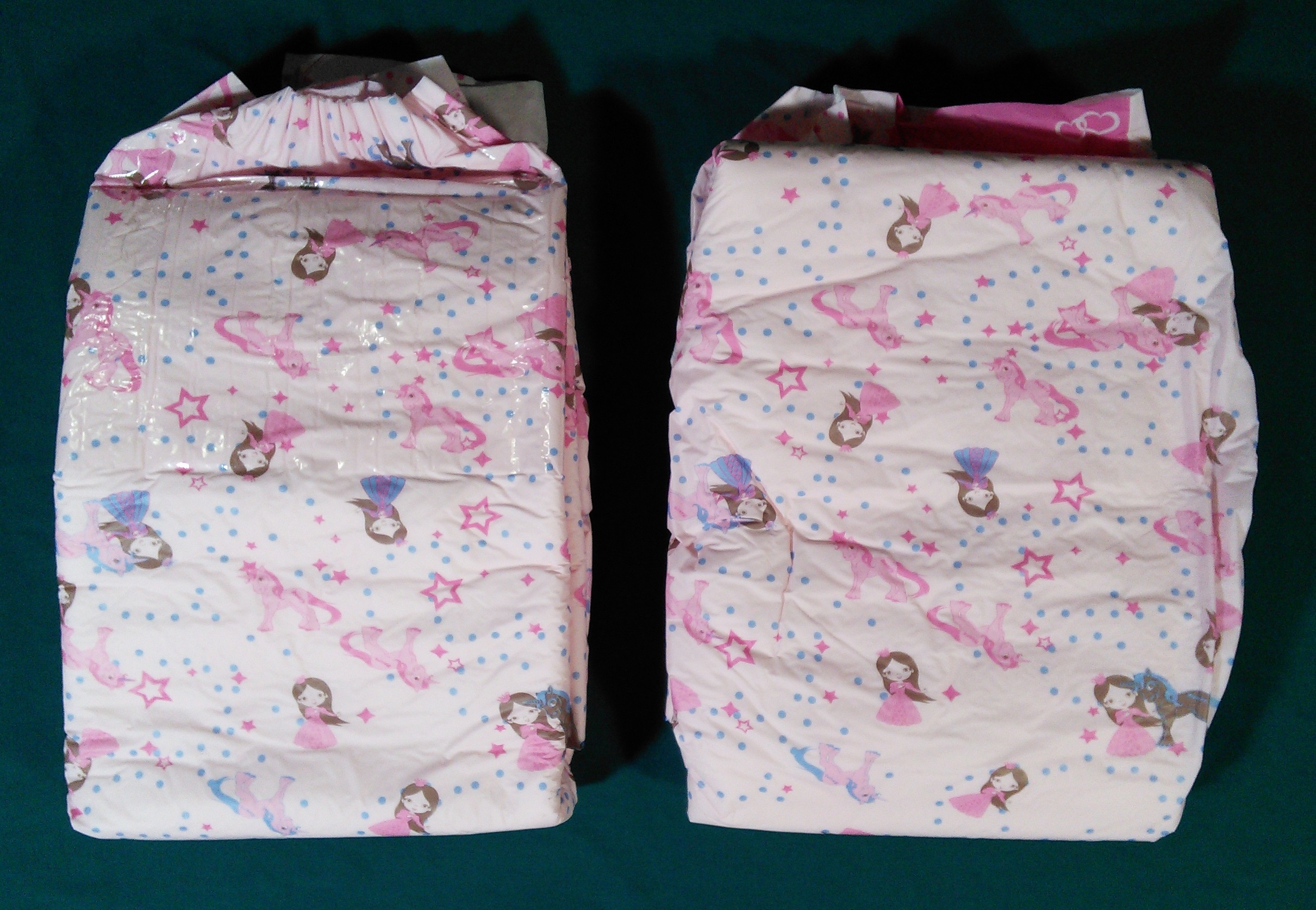Blue plastic brief with pink and baby blue unicorns, dark blue knights; pink, white, and baby blue stars, white clouds, and pink and baby blue diamond-cut gemstones. The wings and leg gathers are dark blue with white hearts. These zones are separated by cloud-shaped white and baby blue stripes. The padding has circular bumps in a hex pattern.