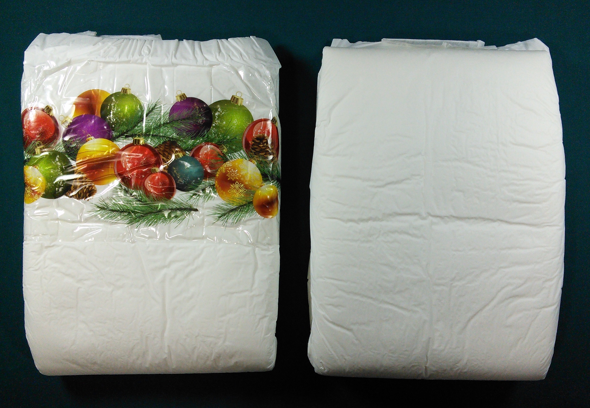 White plastic brief, plain except for the landing zone which has Christmas ornaments, pine cones, and evergreen branches.