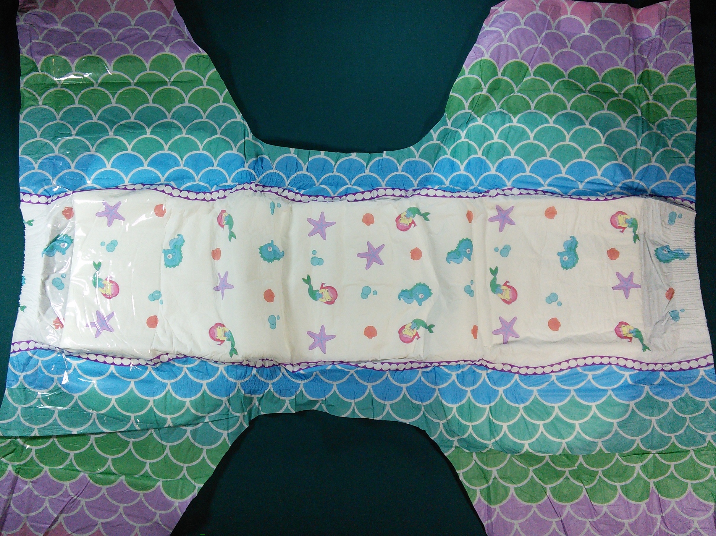 White plastic brief with mermaids, seahorses, seashells, starfish, and bubbles. The wings and gathers have a scaled pattern running from blue through green and purple to violet. Between the main panel and the wings is a thick purple stripe filled with white circles.