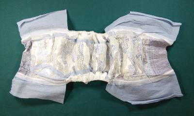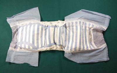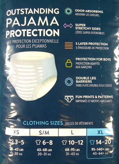 Child pullup, white with blue and gray elements, dark blue waist, blue stretchy side panels, and a faux fly. The back has a gray rectangle with “BACK” and “DOS ATRAS”.