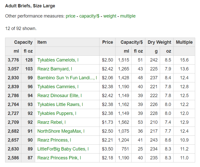 For each of the 329 items we know the weight and in many cases the price and capacity/absorbency. So it's possible to rank diapers by overall capacity, value for the money, and so on.