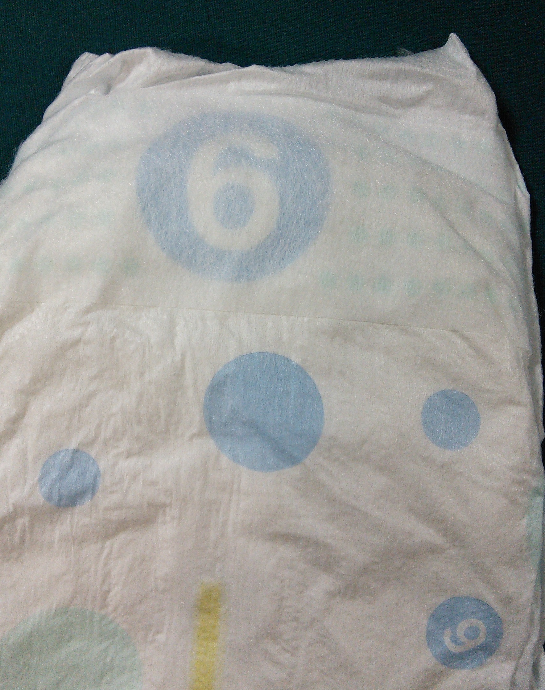 Thick yellow wetness stripe. White padding partially covered with wavy quilting.