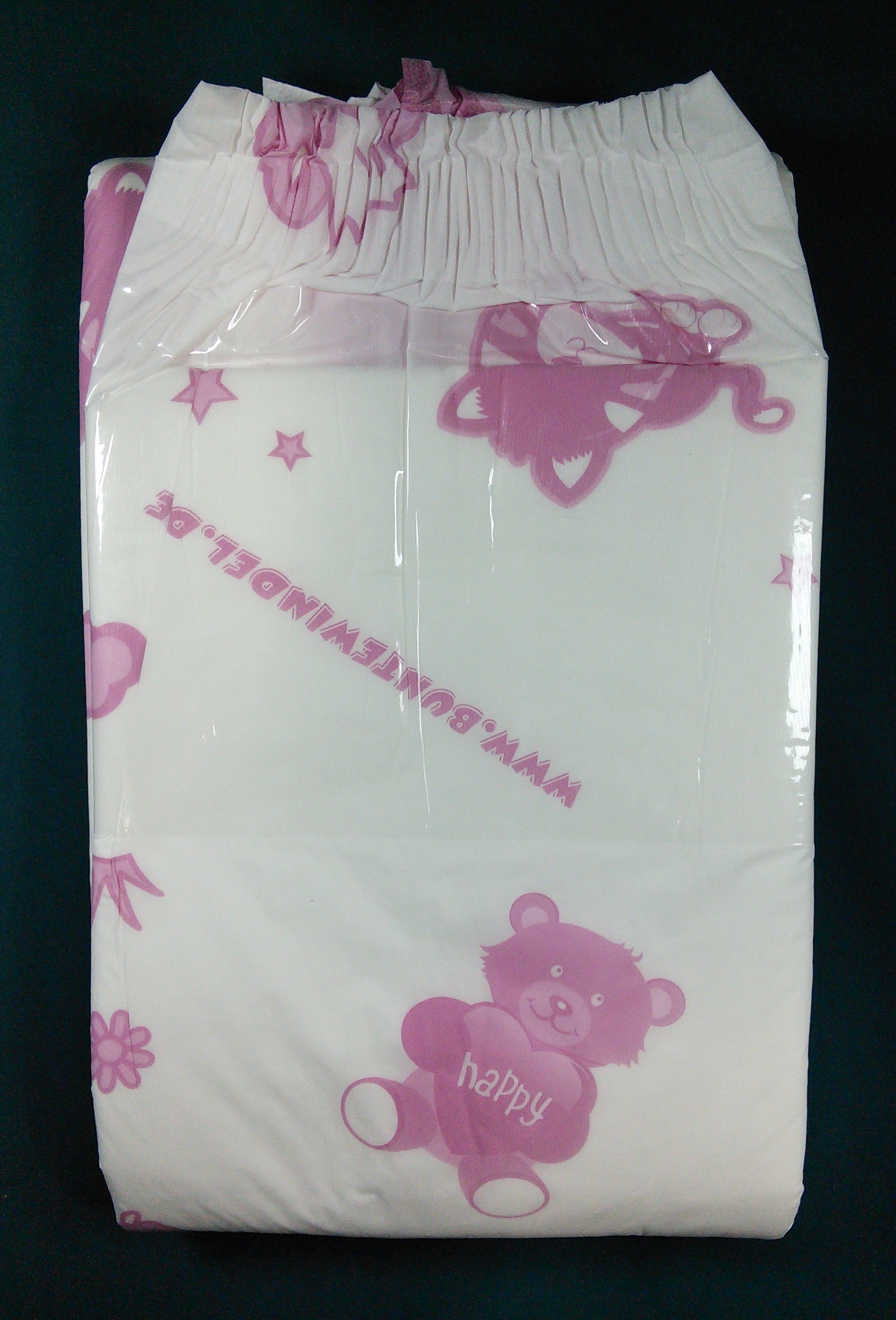 White plastic brief with pink elements: teddy bears with hearts that say “happy”, kittens, poodles, stars, clouds, flowers, crowns, and “www.buntewindel.de”. The wings are plain white. Running down either side of the center panel is a broad wavy light pink band with dark pink stripes and dashes.