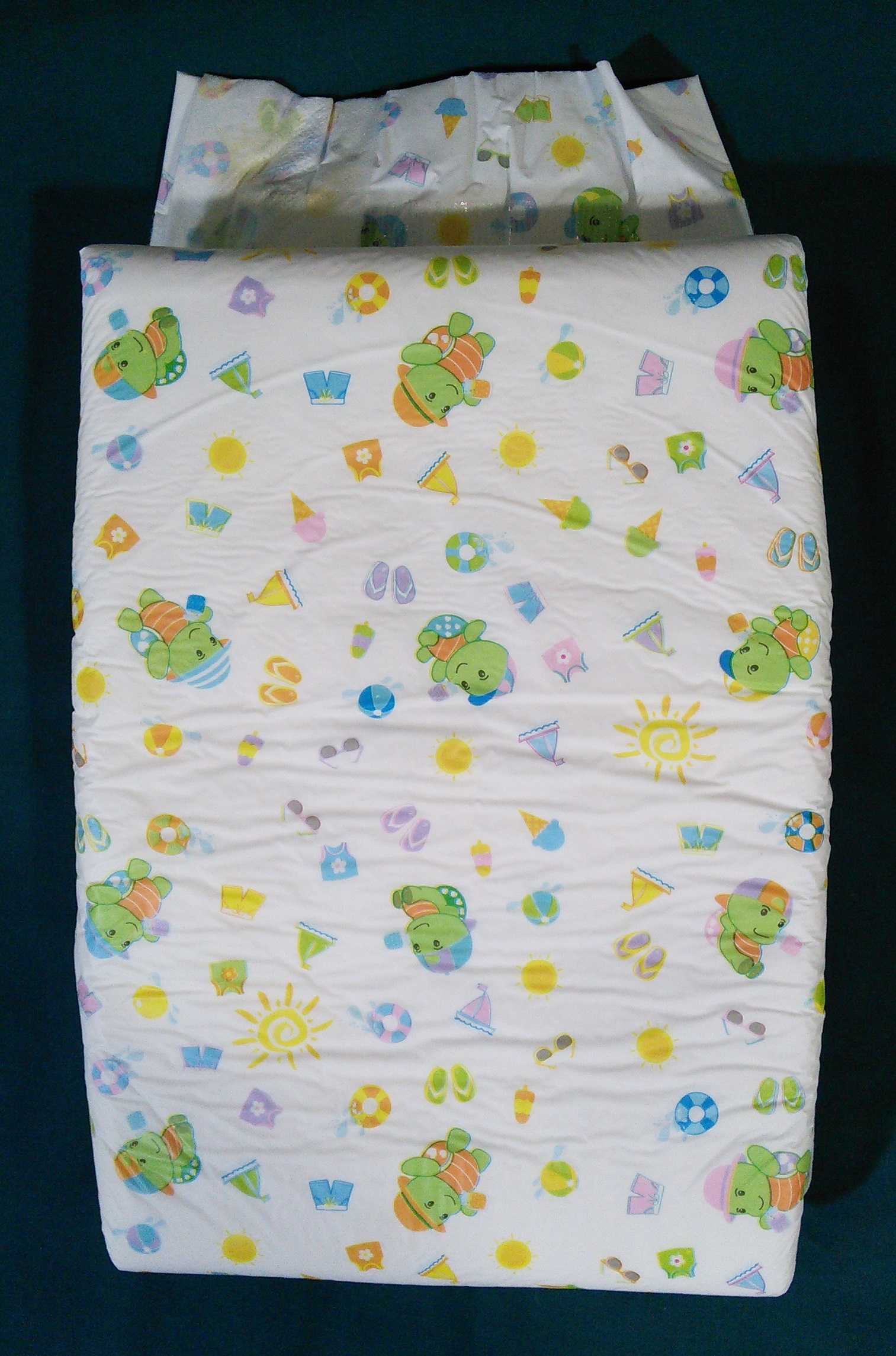 White plastic brief with all-over pattern of little green creatures with baseball hats, beach balls, sandals, sailboats, life preservers, etc. Stretchy wings and velcro tapes like the Bianco Ultrastretch and the Magnifico.