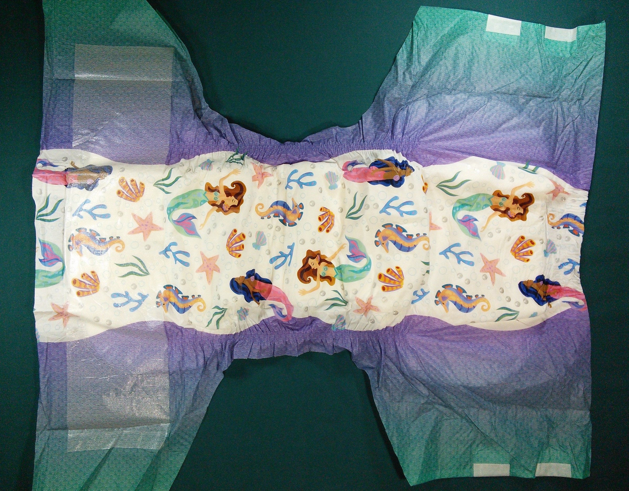 White plastic brief with mermaids, seahorses, seashells, starfish, and bubbles. The wings and gathers have a scaled pattern running from blue through green and purple to violet. Between the main panel and the wings is a thick purple stripe filled with white circles.