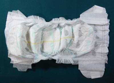Thick yellow wetness stripe. White padding partially covered with wavy quilting.