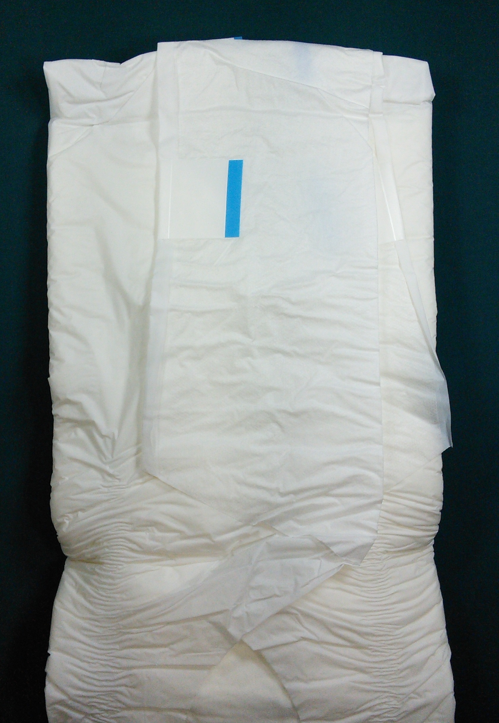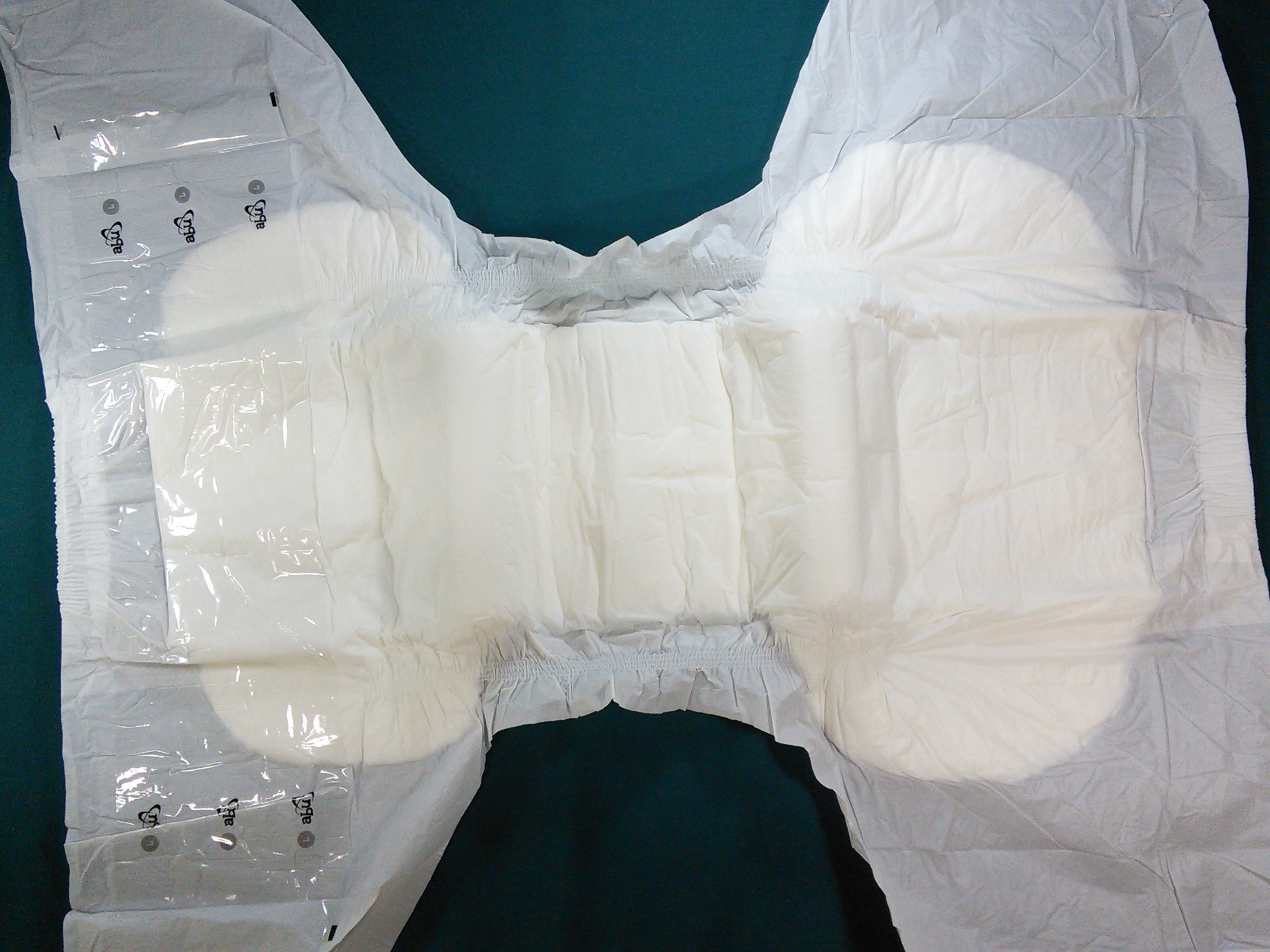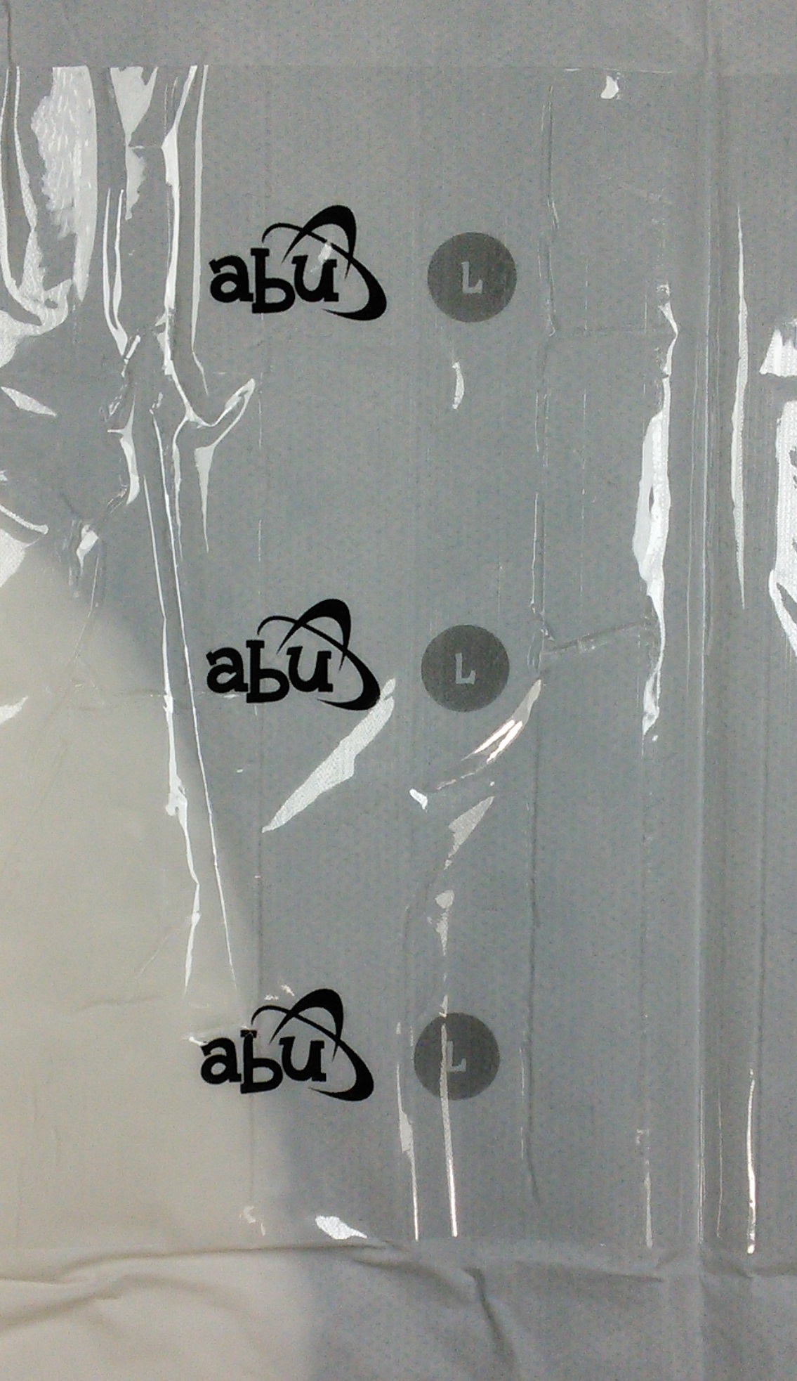 White plastic brief, plain except for an “abu” logo and the size initial on the wings (covered up when taped on).