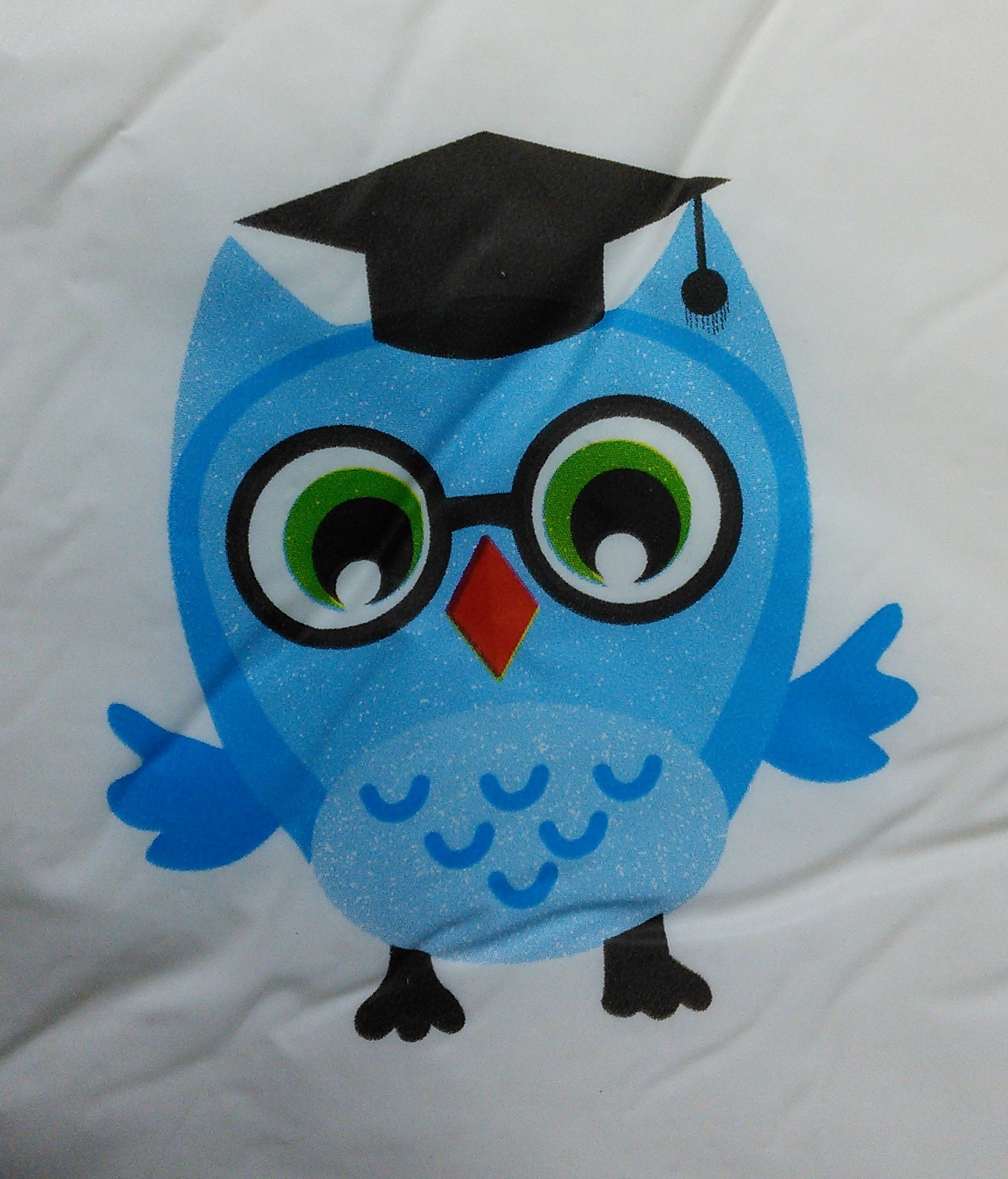 White plastic brief with “A B C”, “1 + 2 = 3”, books, backpacks, apples, crayons, and owls. Rough landing zone and velcro tapes.