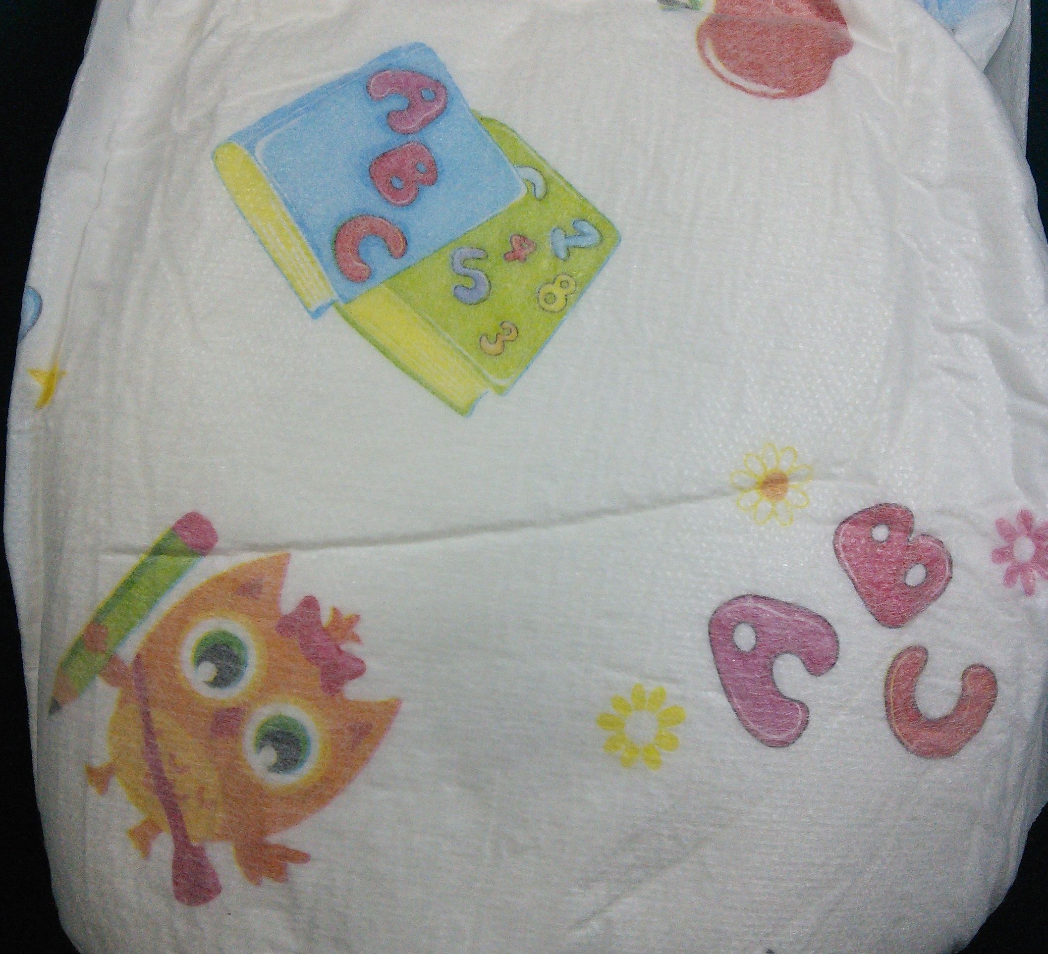 White thick pull-up with “A B C”, “1 + 2 = 3”, books, backpacks, apples, crayons, and owls.