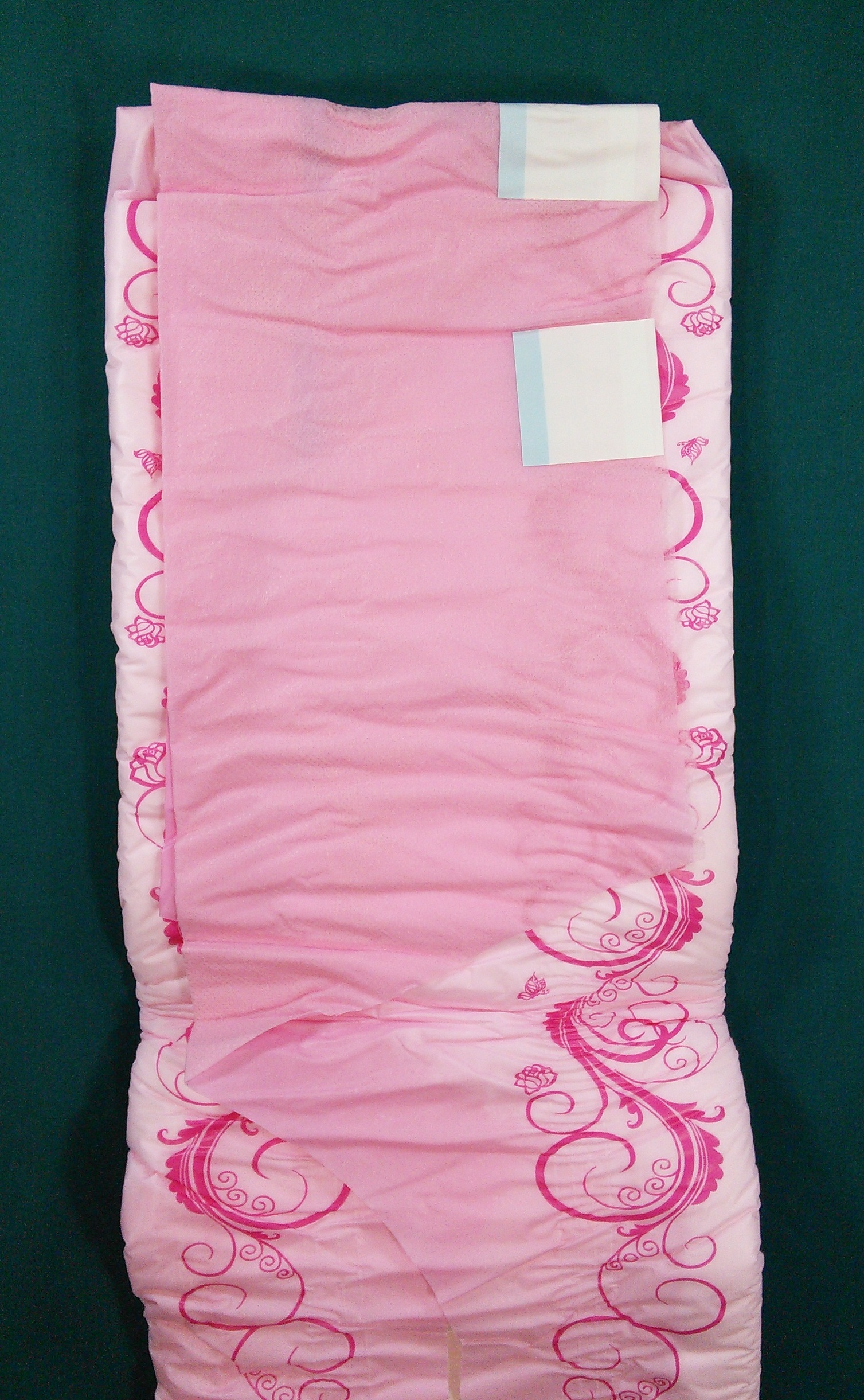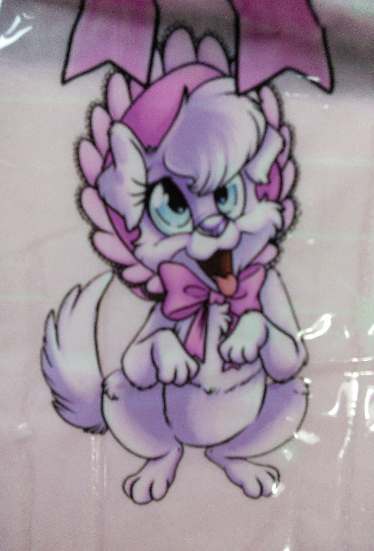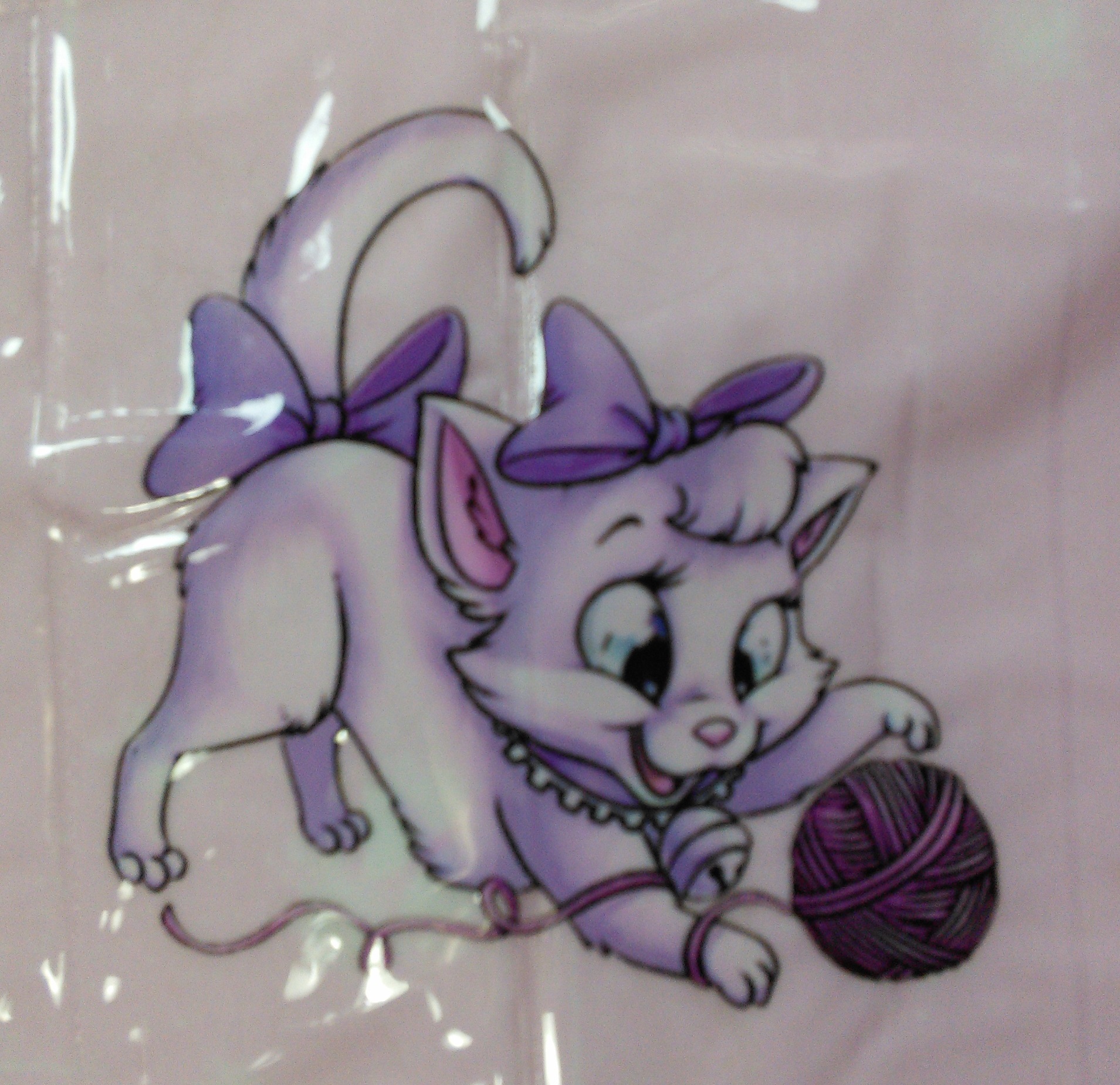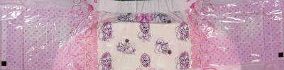 Light pink plastic brief with white stars and a dark pink swirly vine pattern running down the sides and through the leg gathers. The landing zone has puppies in baby bonnets and kittens playing with balls of twine, with left and right borders made of hearts and the sides of the landing zone filled with a pattern of tiny icons including hearts, rattles, diaper pins, and ducks.