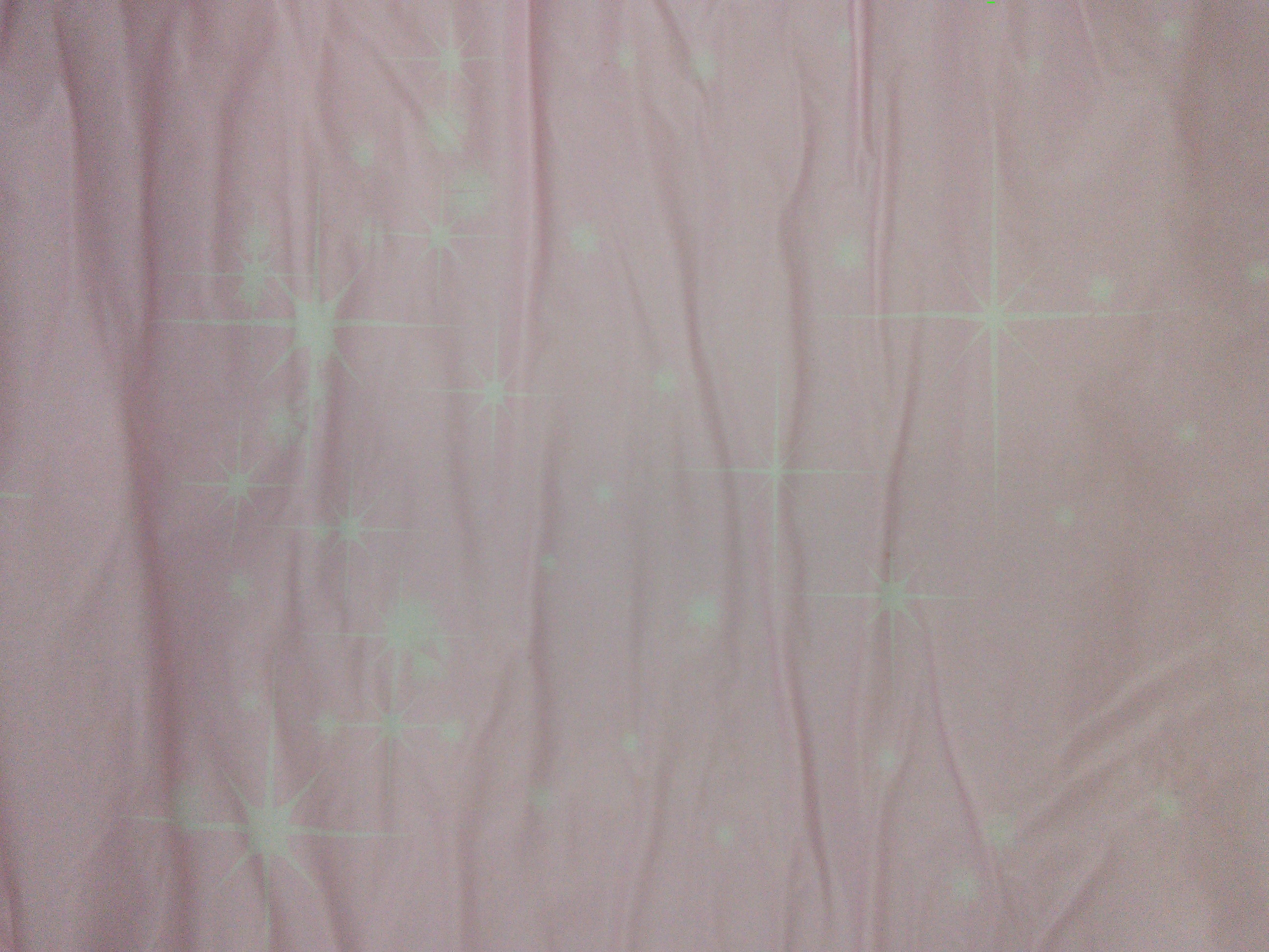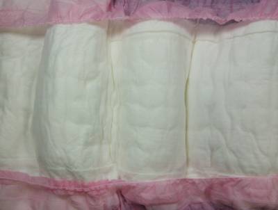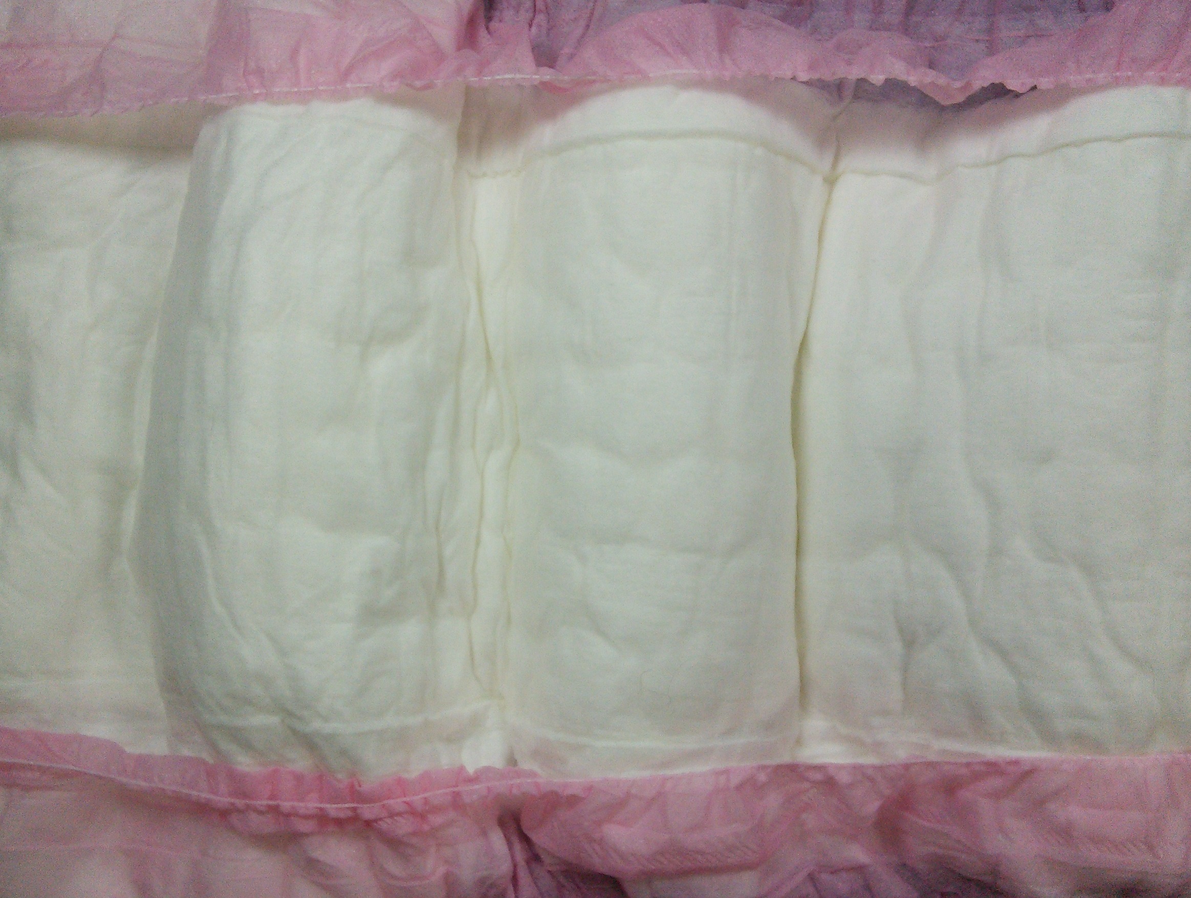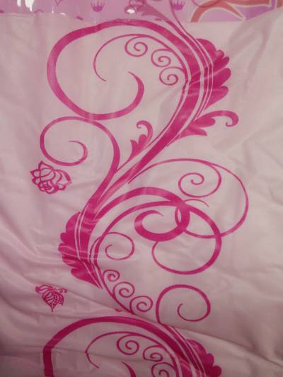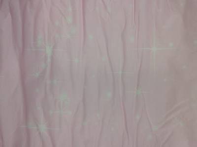 Light pink plastic brief with white stars and a dark pink swirly vine pattern running down the sides and through the leg gathers. The landing zone has puppies in baby bonnets and kittens playing with balls of twine, with left and right borders made of hearts and the sides of the landing zone filled with a pattern of tiny icons including hearts, rattles, diaper pins, and ducks.