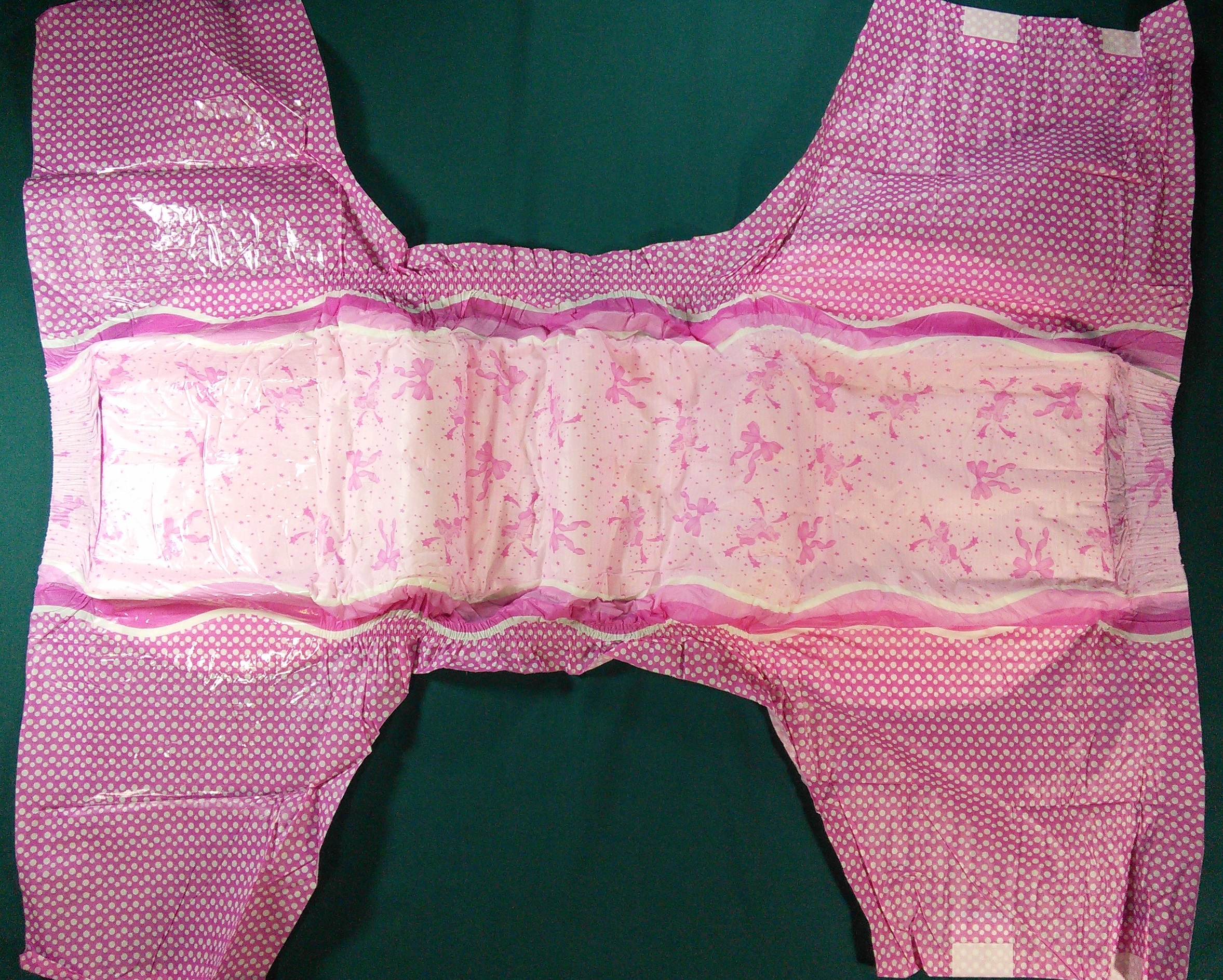 Pink plastic brief with dark pink ponies, ribbons, and stars. Wings and gathers are dark pink with white polka dots. The padding has circular bumps in a hex pattern.
