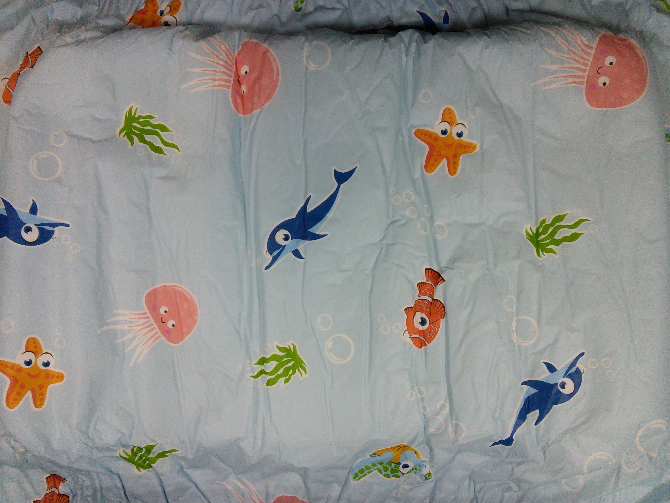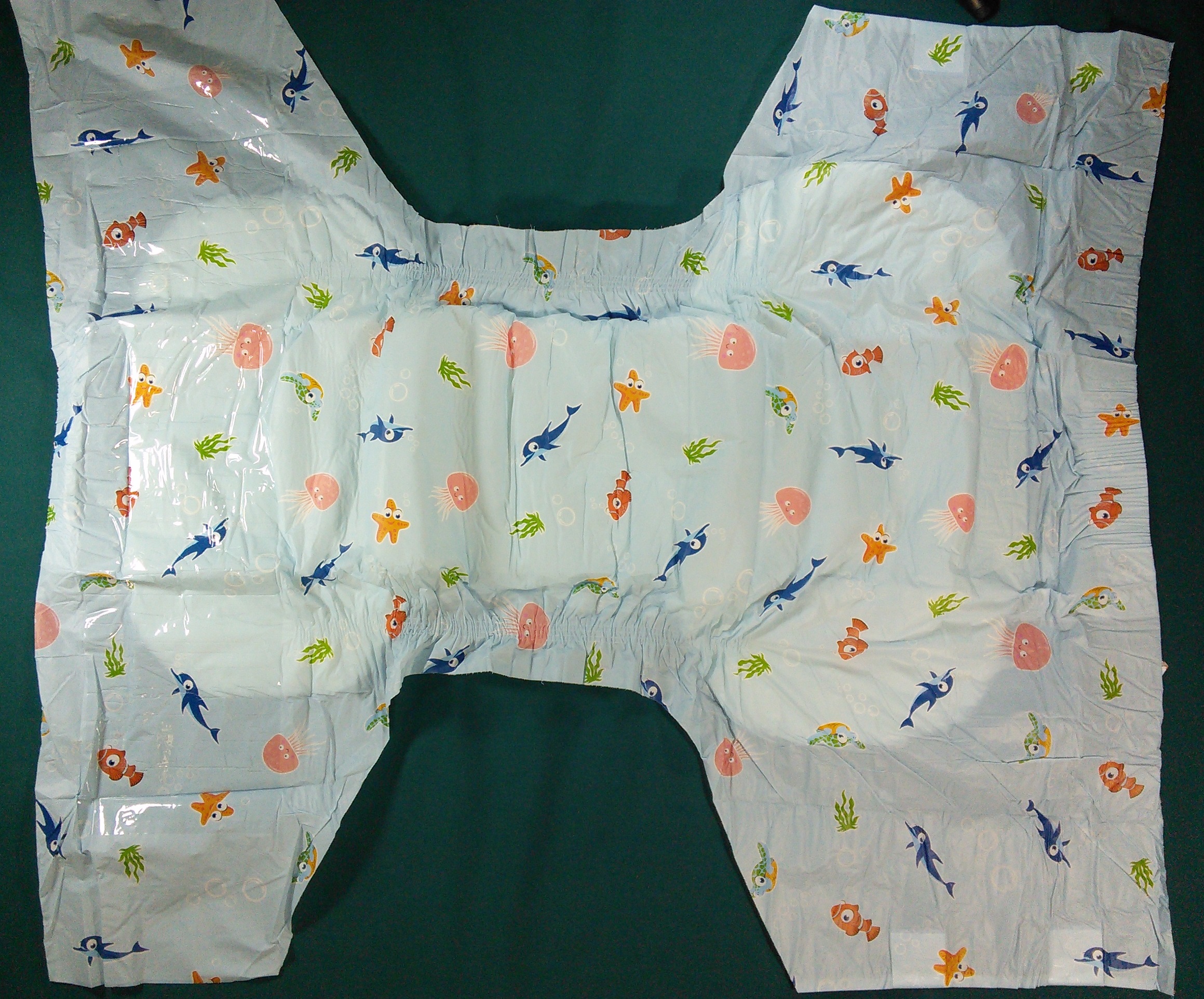 Light blue plastic brief with dolphins, seaweed, jellyfish, fish, starfish, and bubbles.