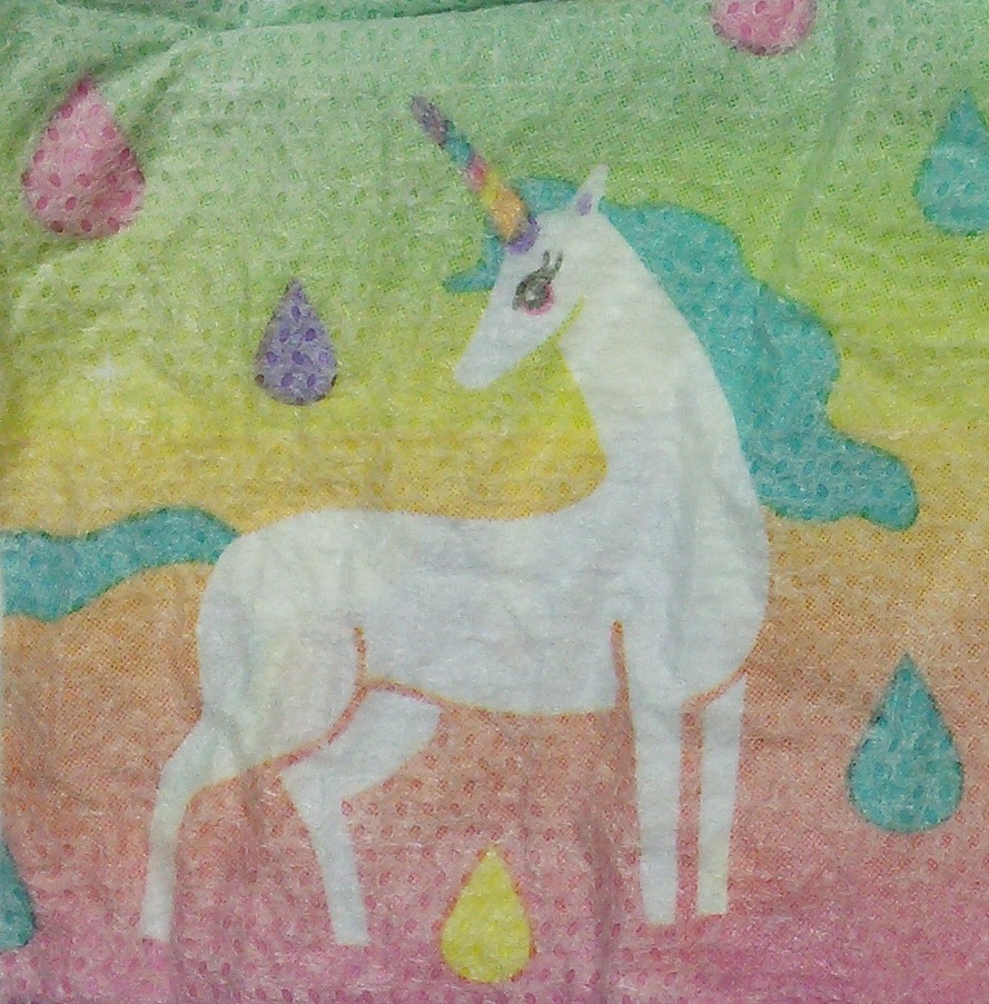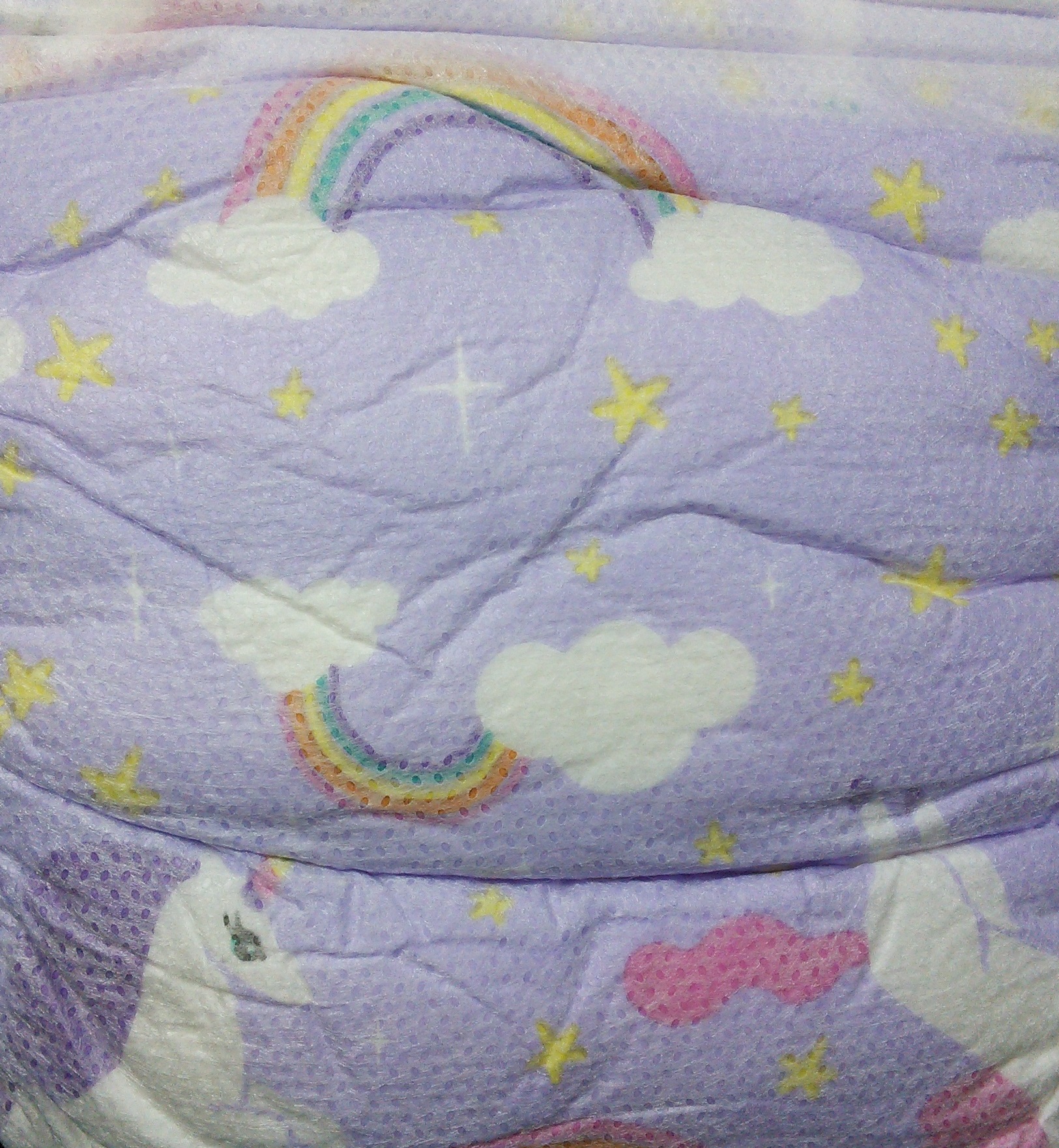 Purple child pull-up with rainbows, unicorns with rainbow-colored horns, clouds, raindrops, and stars.
