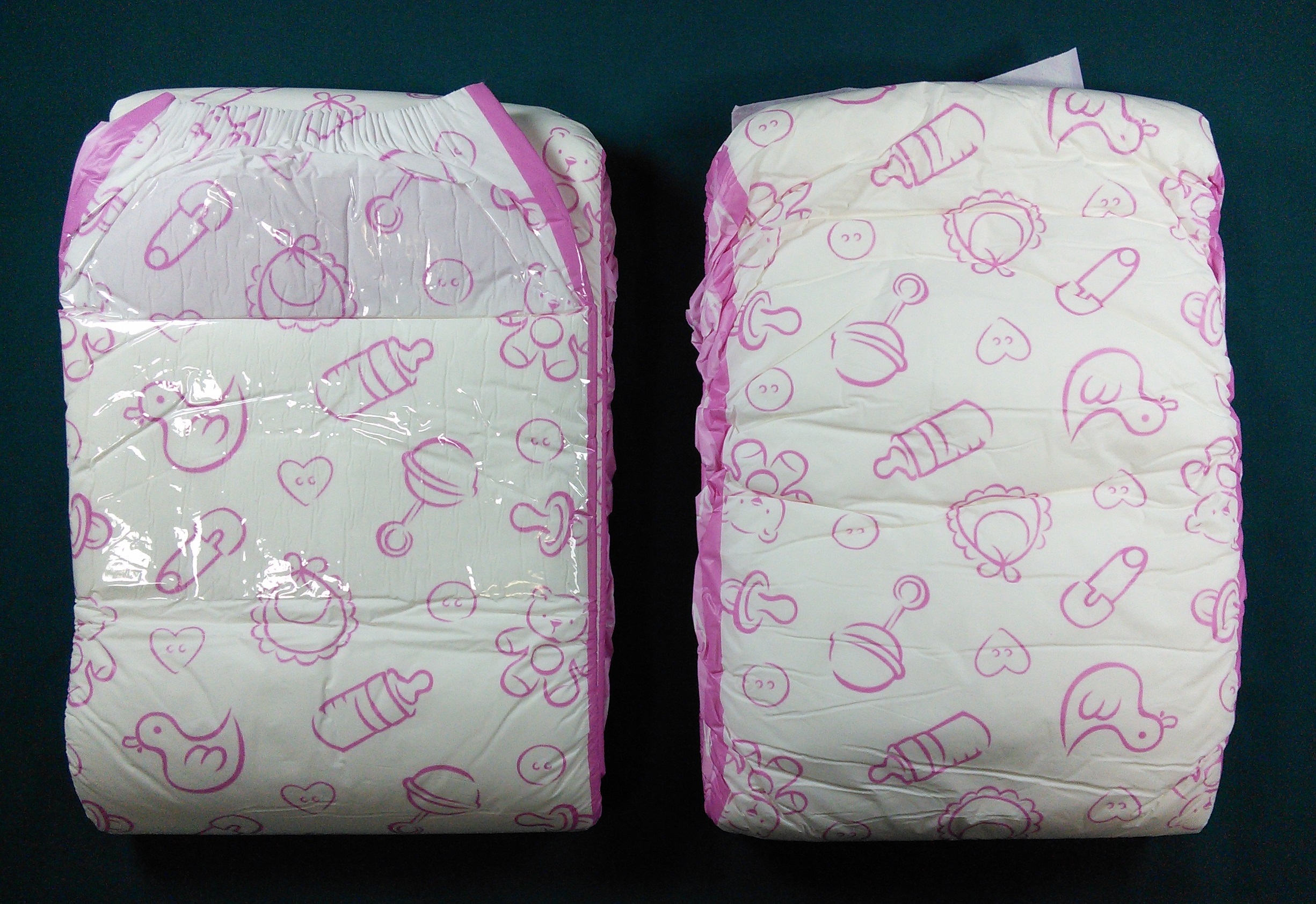 White plastic brief with pink-outlined teddy bears, ducks, hearts, baby bottles, diaper pins, pacifiers, and baby bonnets. Side panels and leg gathers are pink with white “baby” and hearts.