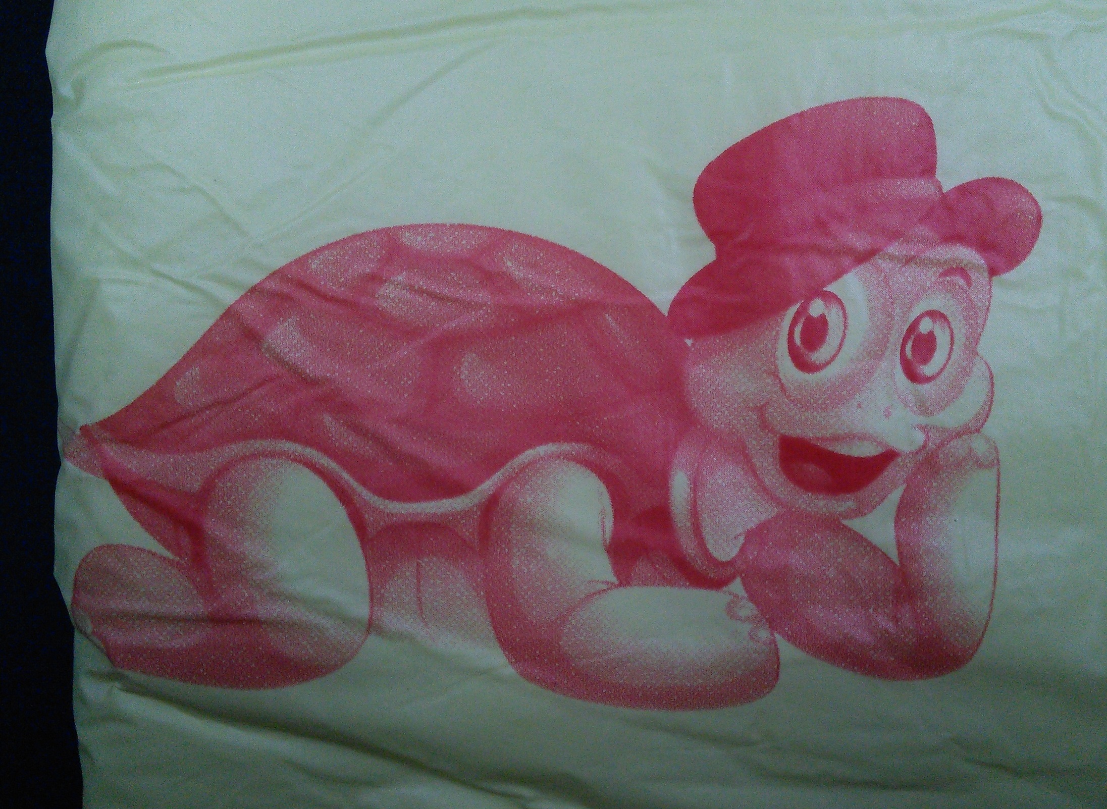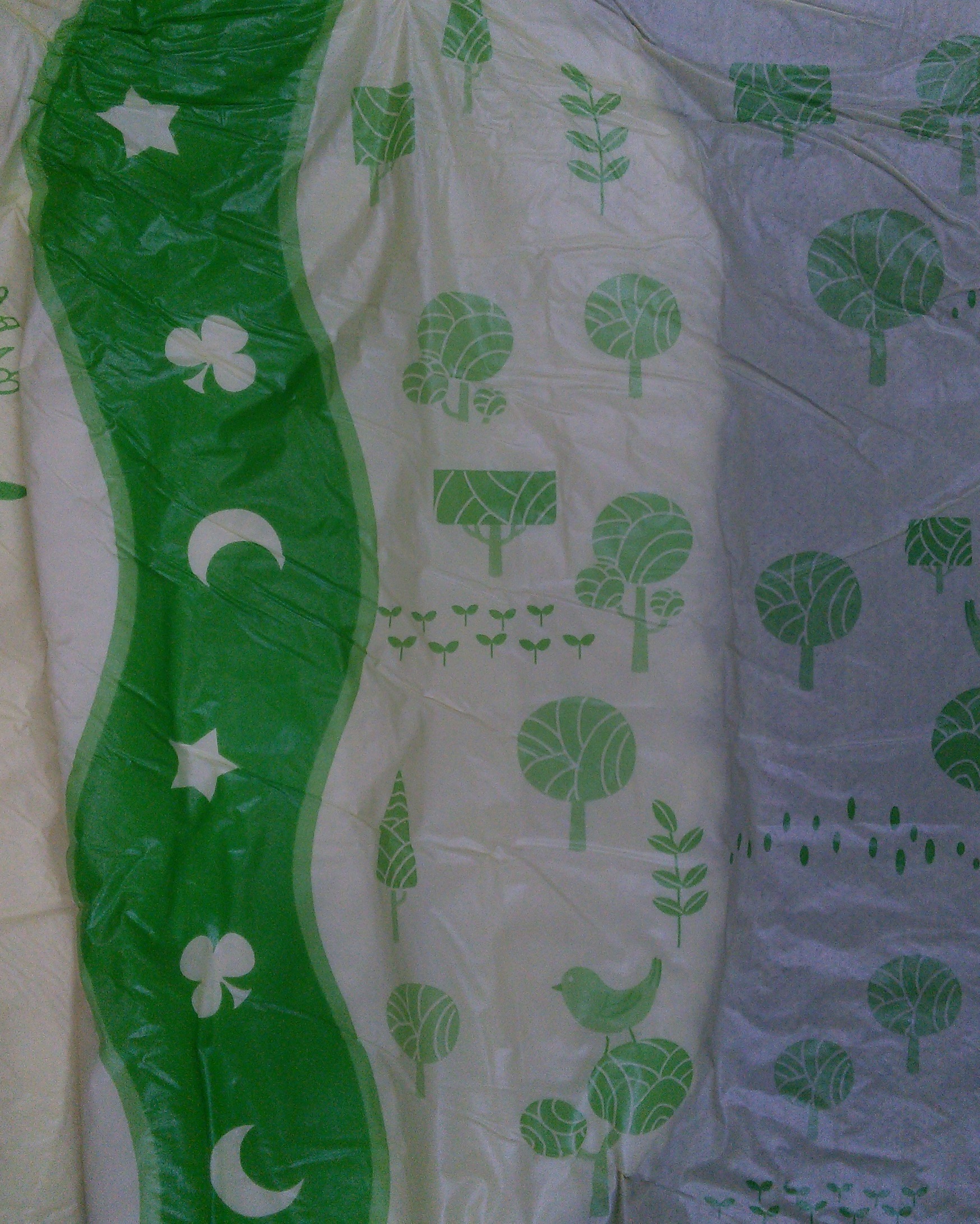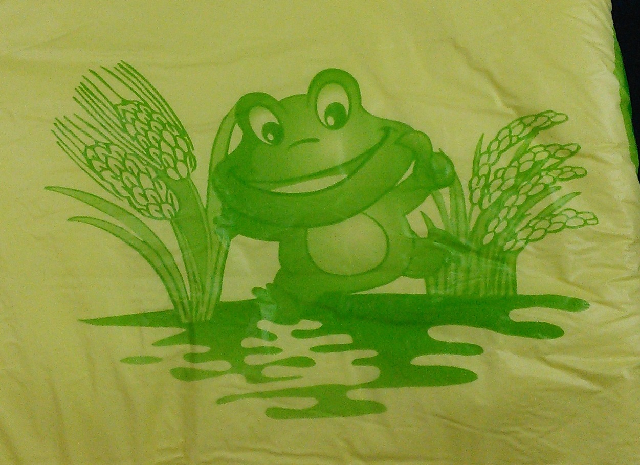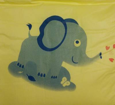 Yellow plastic with turtles, frogs, elephants, moons, stars, and clovers. Wavy green ribbon running down the sides and around to the back with yellow moons, stars, and clovers.