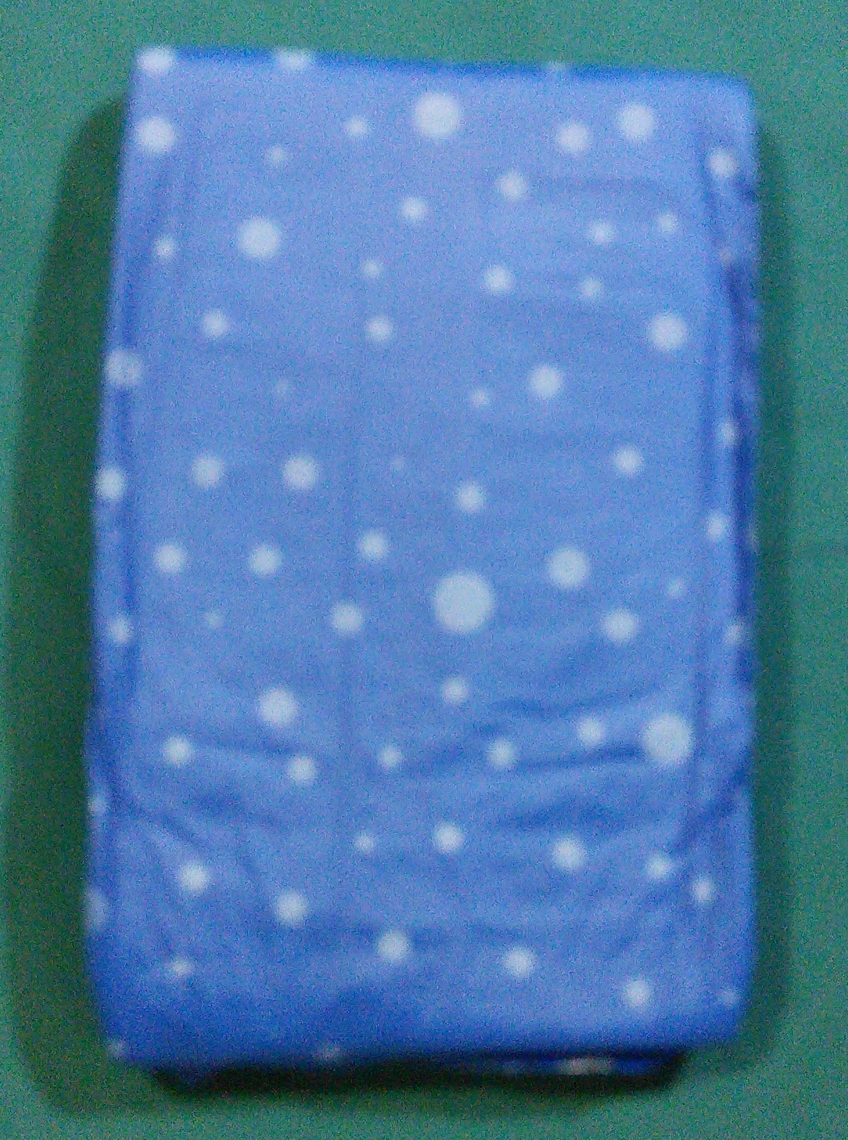 Dark blue brief with light blue polka dots of various sizes.