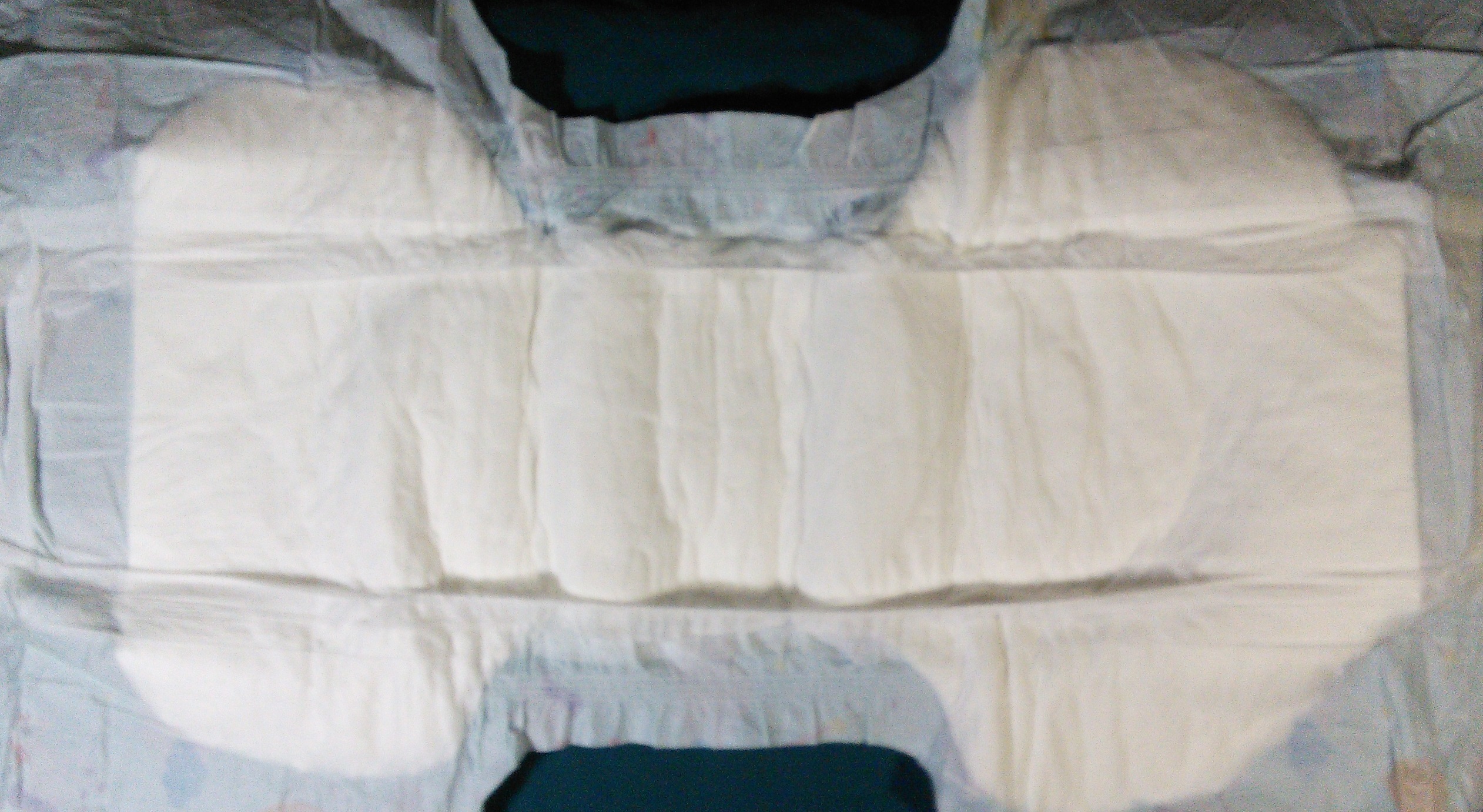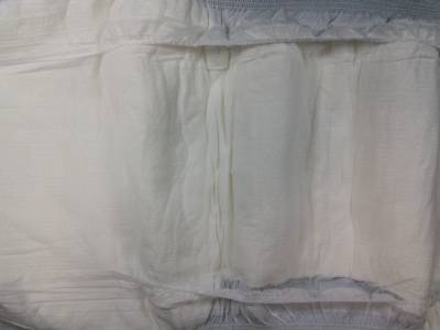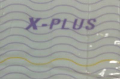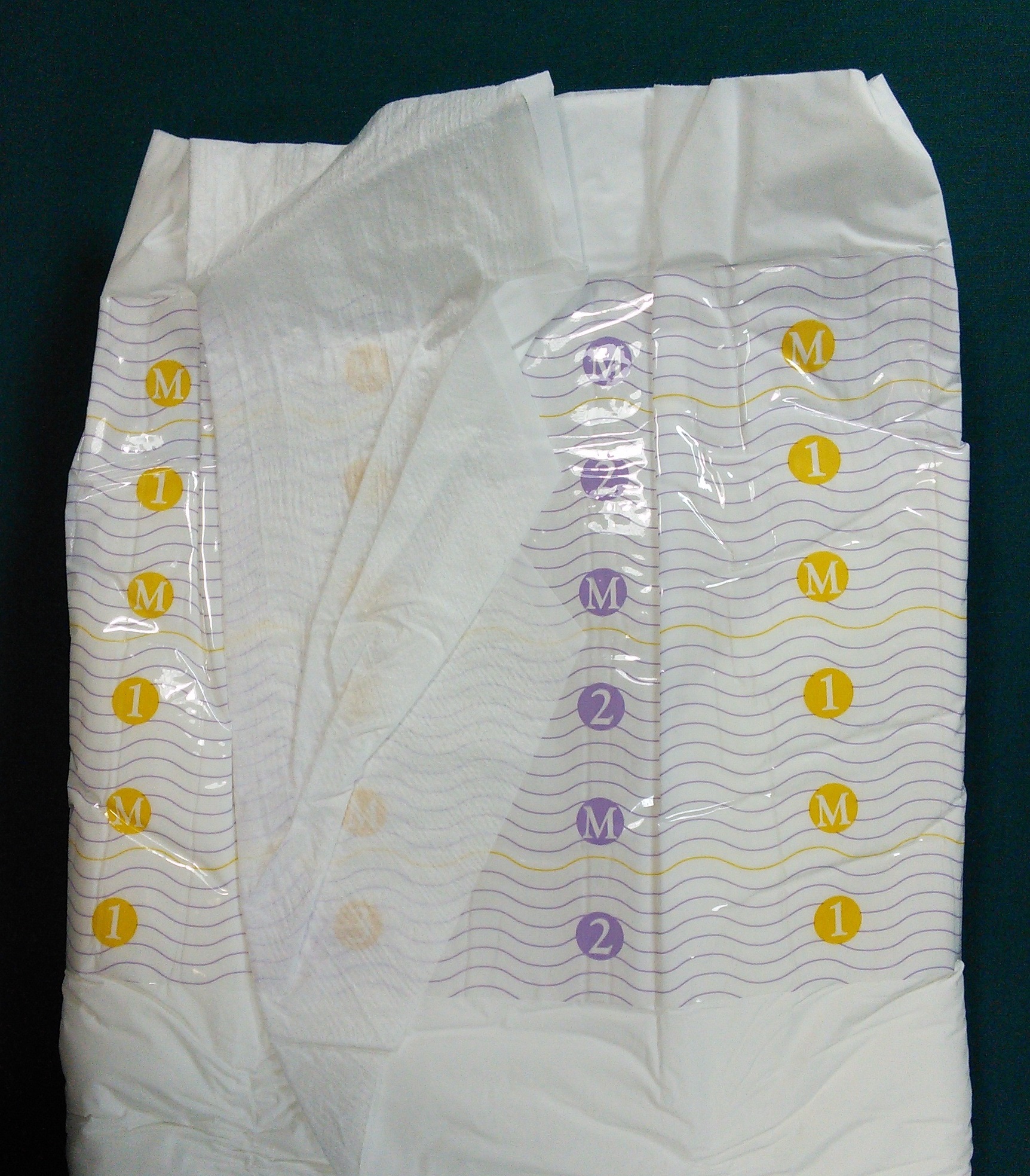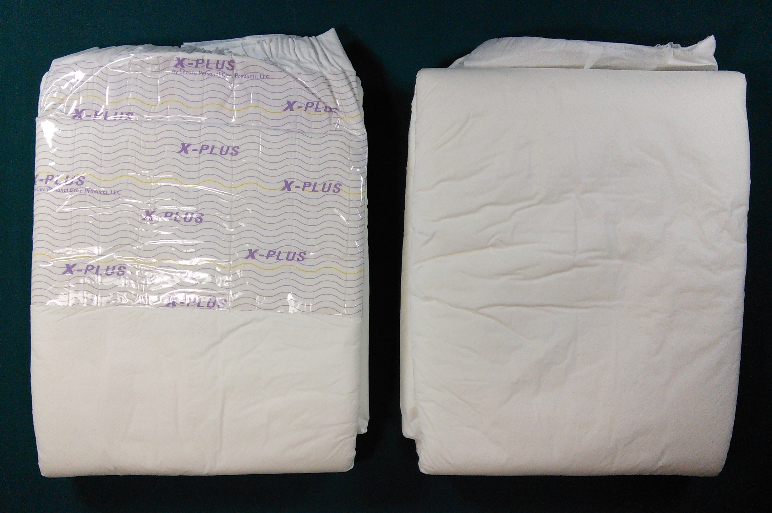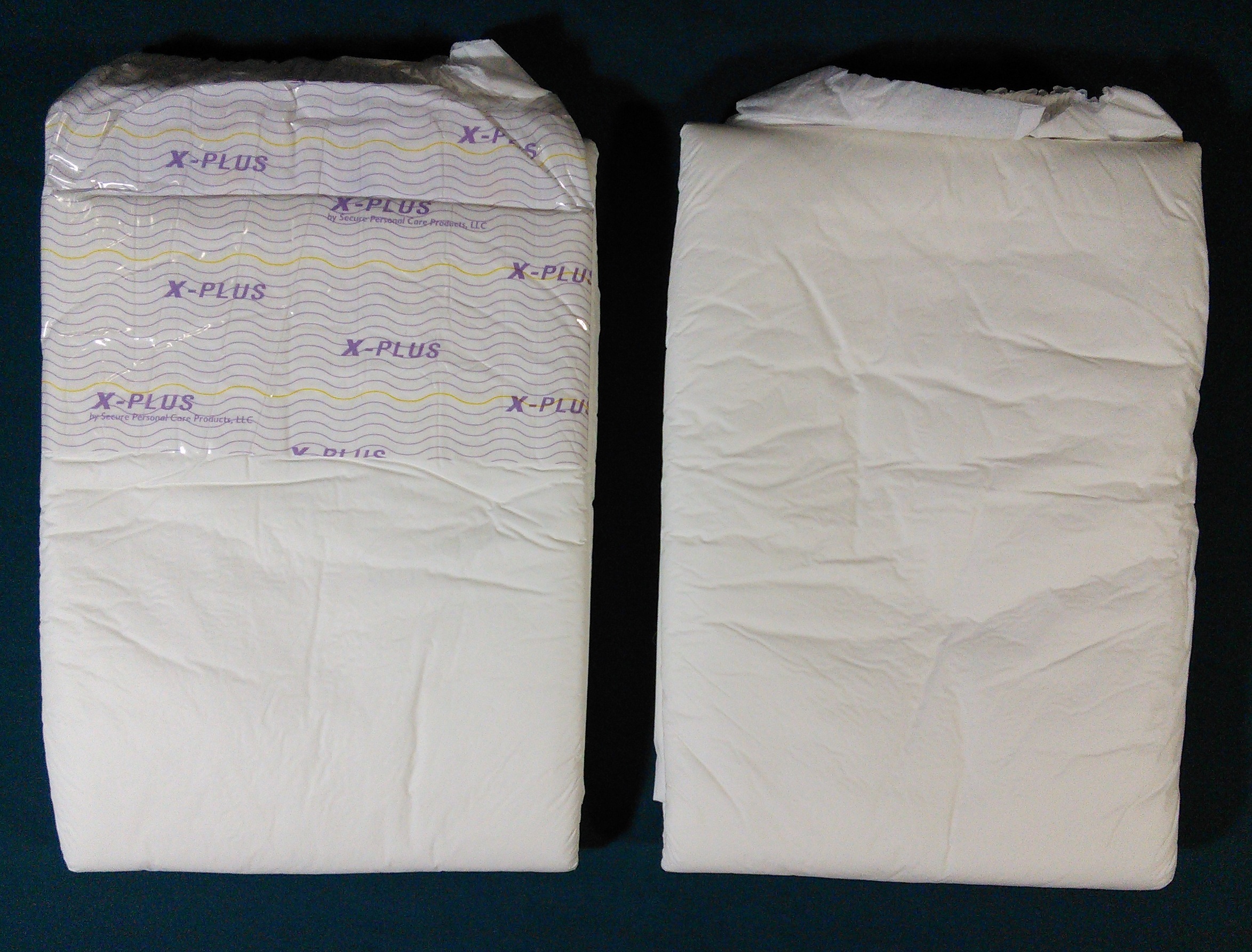 White plastic brief, plain except for the landing zone which has wavy purple and yellow lines and “X-PLUS by Secure Personal Care Products”.