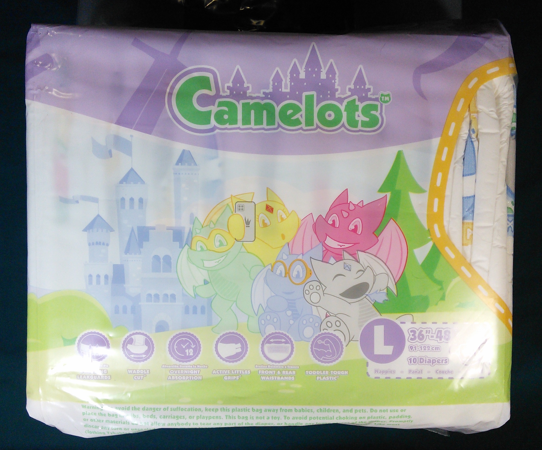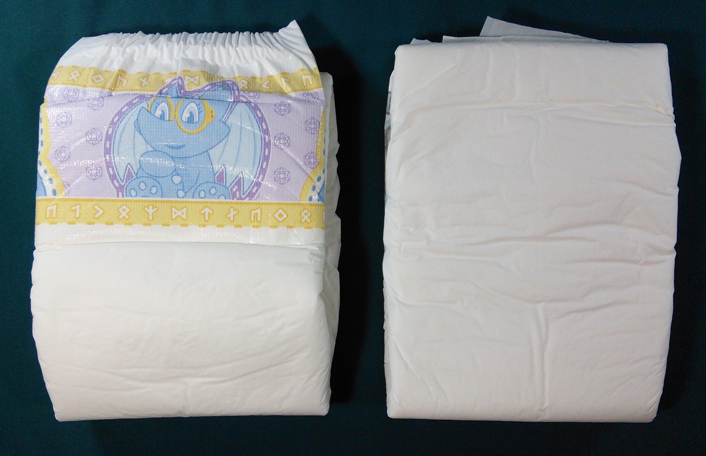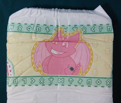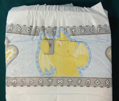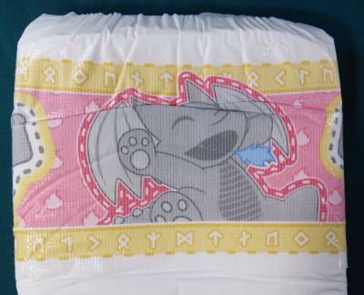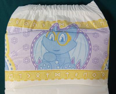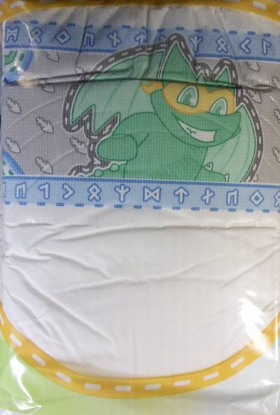 White plastic brief. Baby dragon on front of landing zone. Runes along the top and bottom. Plain white outside of the landing zone.