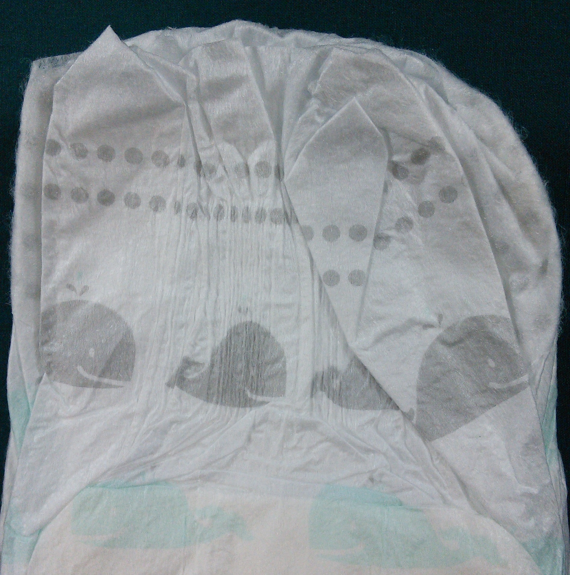 Thick yellow wetness stripe. White padding partially covered with wavy quilting.