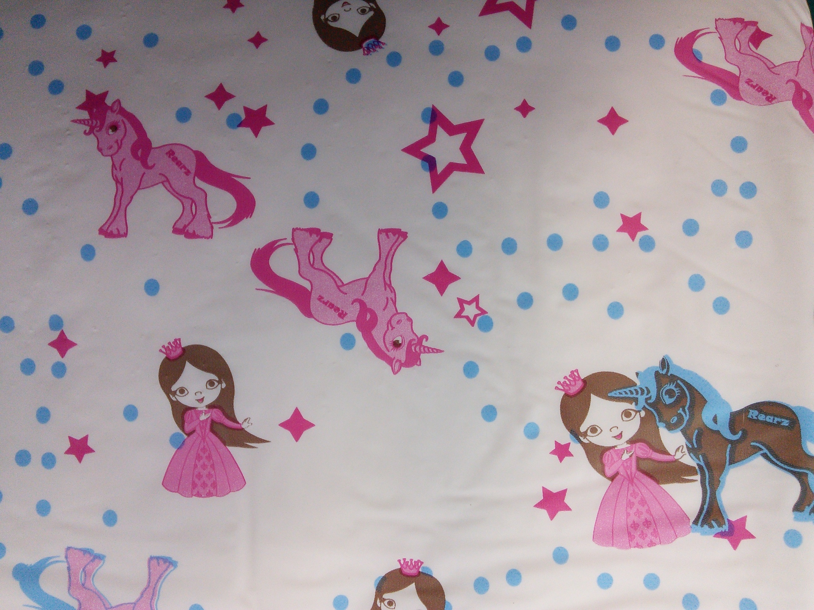 White plastic brief with princesses and unicorns. Large dark pink panels on wings and leg gathers.