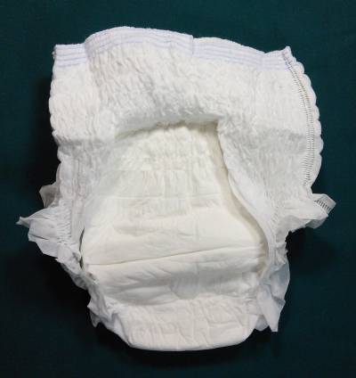 Plain white thick pull-up; scrunchy waist with four thin blue lines at the top back; white padding.