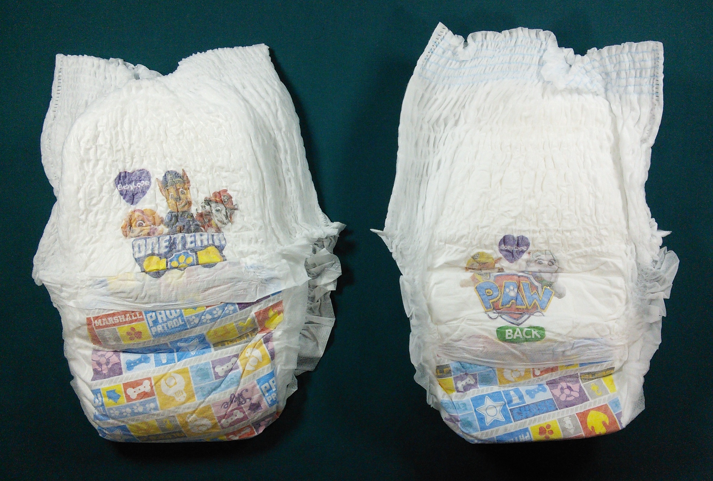 White child pull-up with Paw Patrol characters and a panel running from below the front waist around to below the back waist with rectangles containing words and graphics.