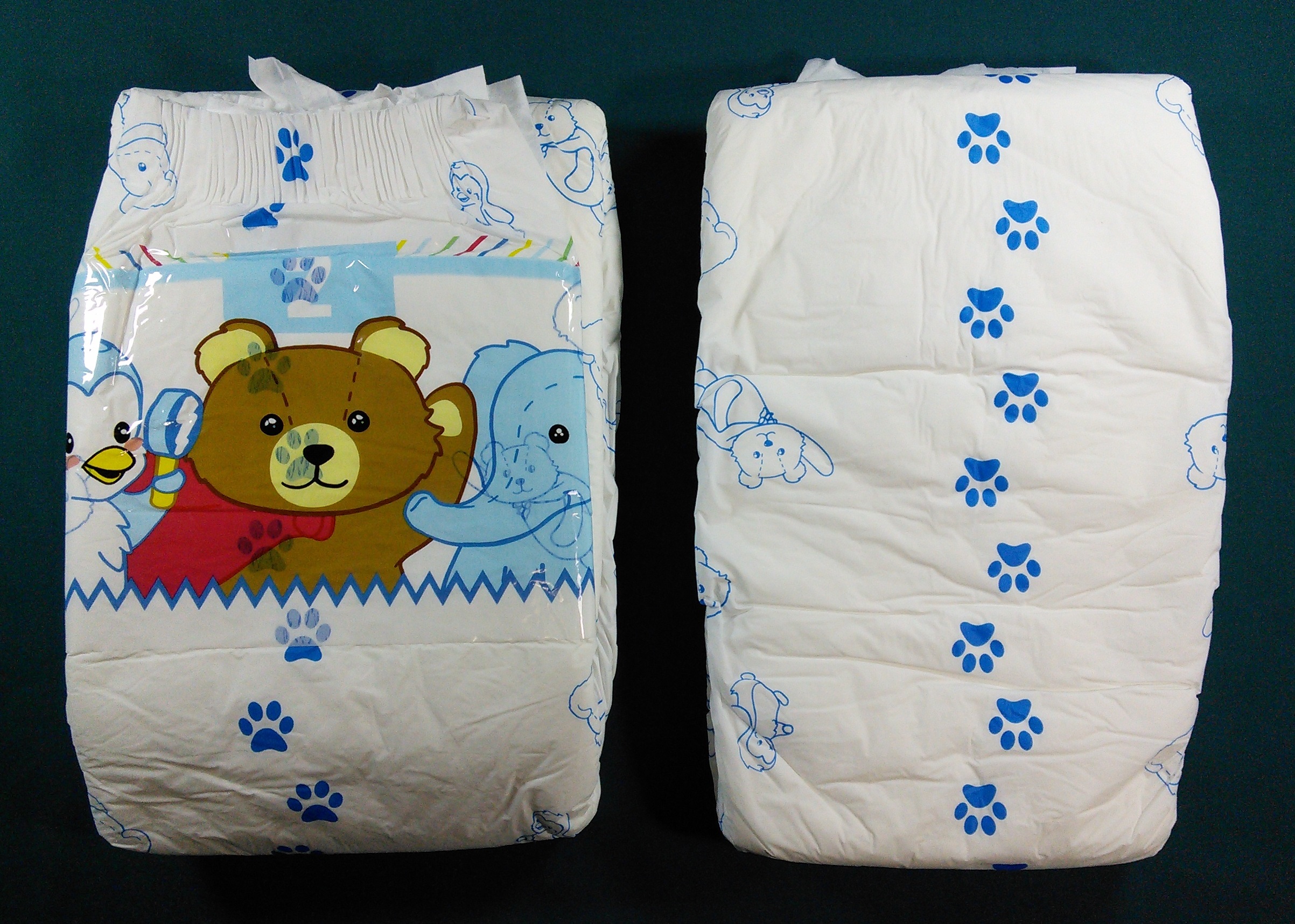 White plastic brief with three variants of the landing zone design. The rest of the shell has blue paw prints, and blue-outlined penguins, elephants, and flying teddy bears with capes. The padding has circular bumps in a hex pattern.