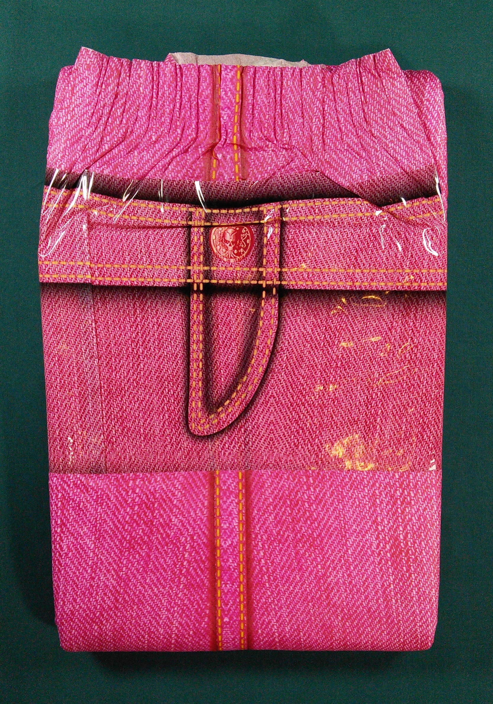 Red plastic brief with a jeans print. The landing zone shows the front of a pair of jeans with the pockets, fly, and belt loops. The borders between the main panel and the wings are seams with fancy stitching.