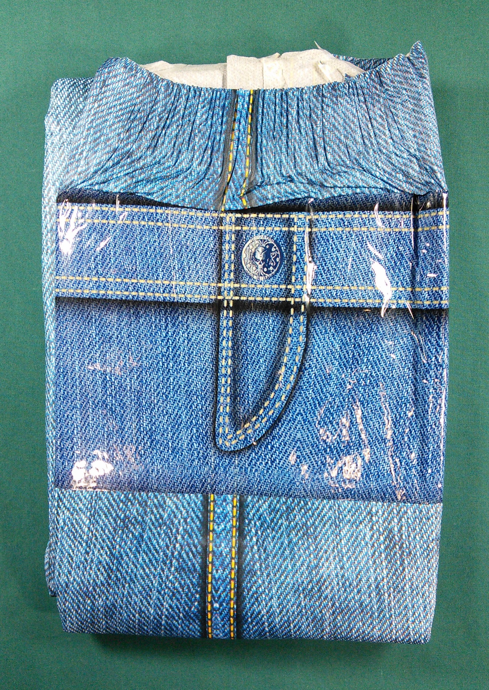 Blue plastic brief with a jeans print. The landing zone shows the front of a pair of jeans with the pockets, fly, and belt loops. The borders between the main panel and the wings are seams with fancy stitching.