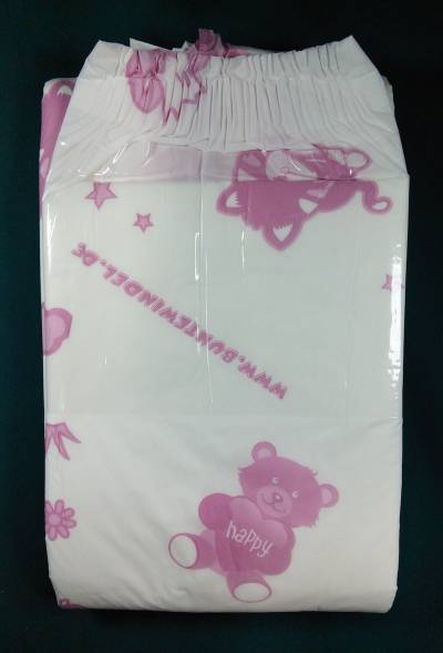 White plastic brief with baby blue teddy bears with hearts that say “happy”, kittens, poodles, clouds, trees, crowns, and “www.buntewindel.de”. Pink and blue stars. Pink flowers. The wings are plain white. Running down either side of the center panel is a broad wavy baby blue band with darker blue stripes and dashes.