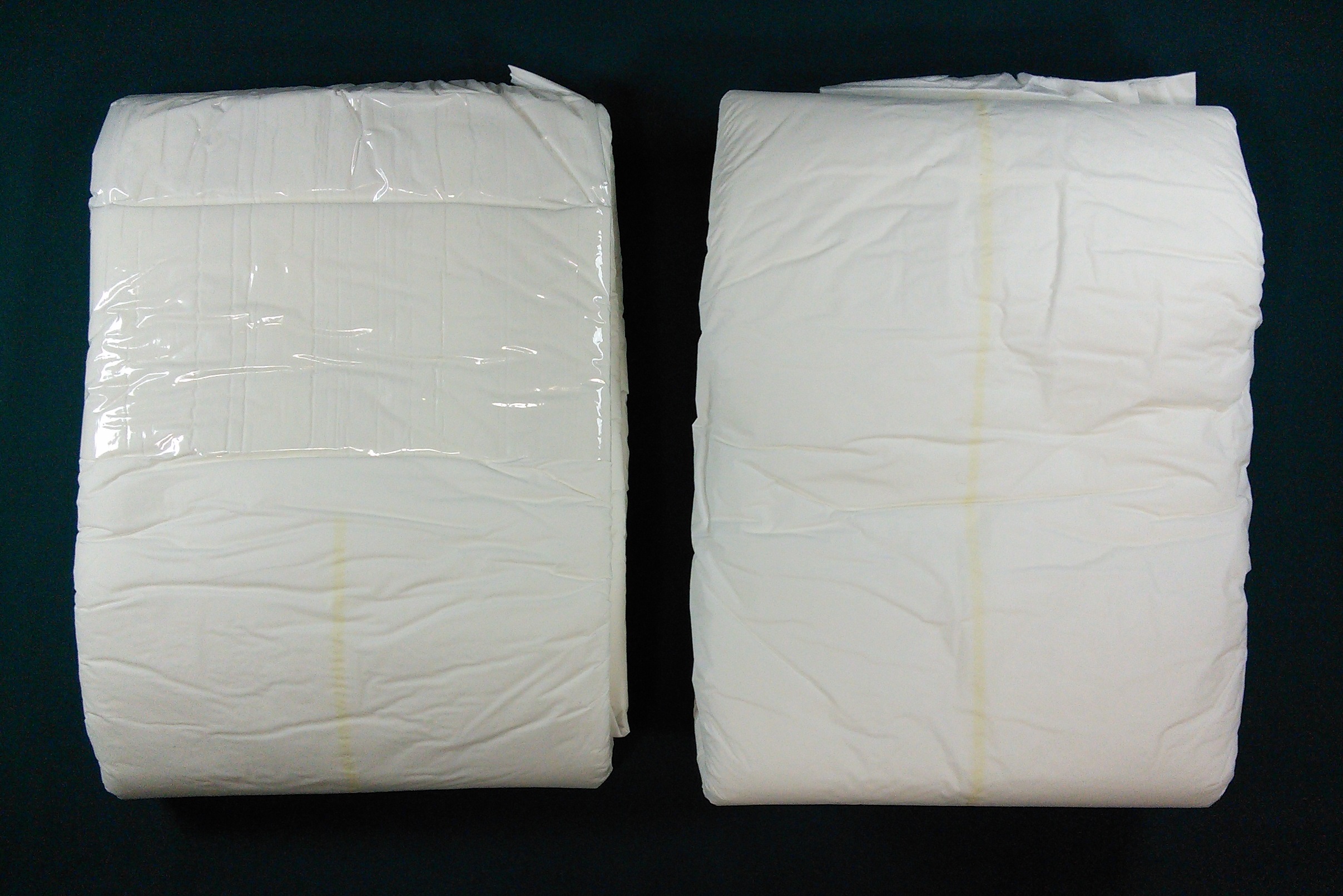 White plastic brief, plain except for a wetness stripe.
