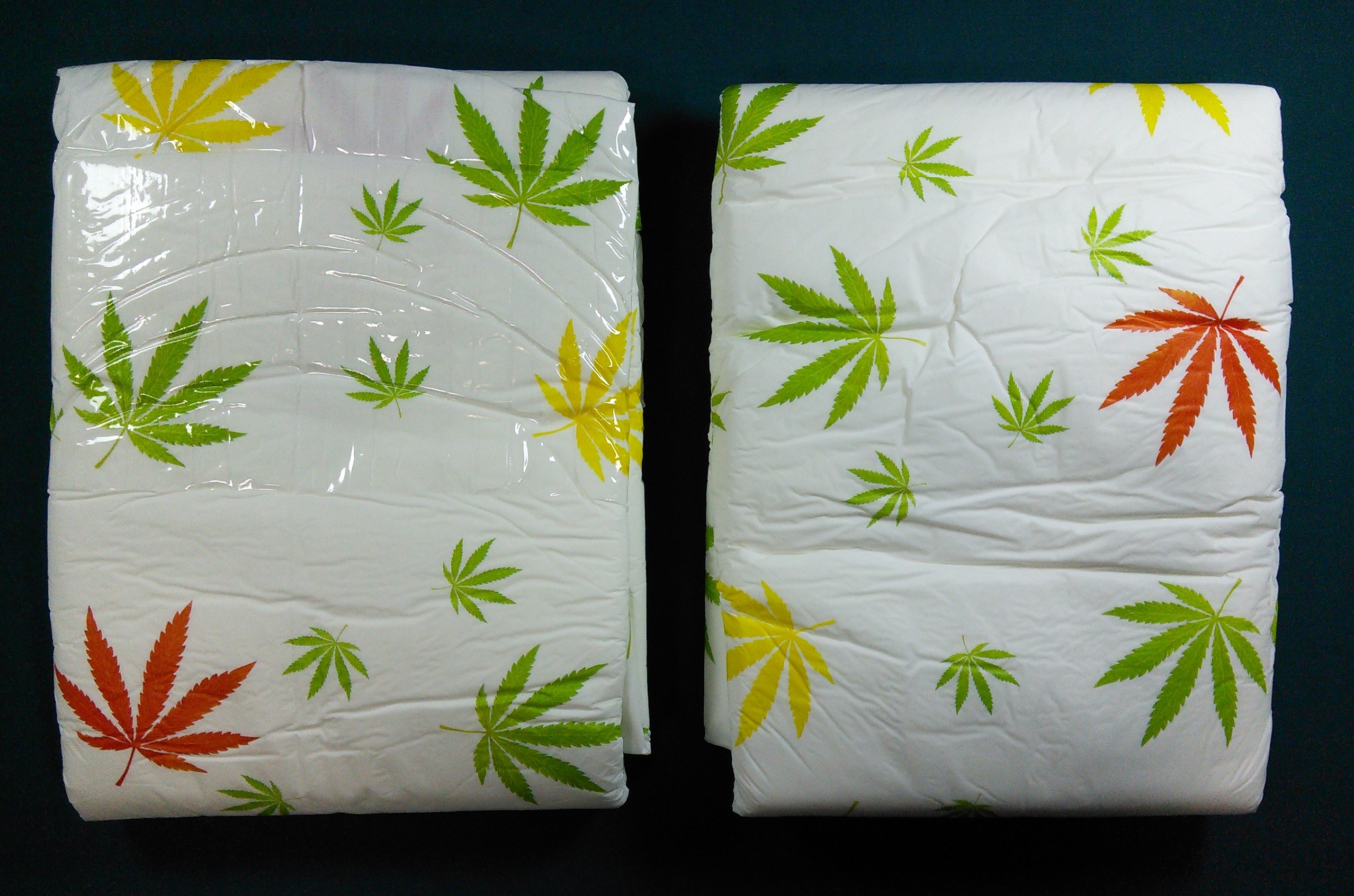 White plastic brief with green, yellow, and red marijuana leaves.