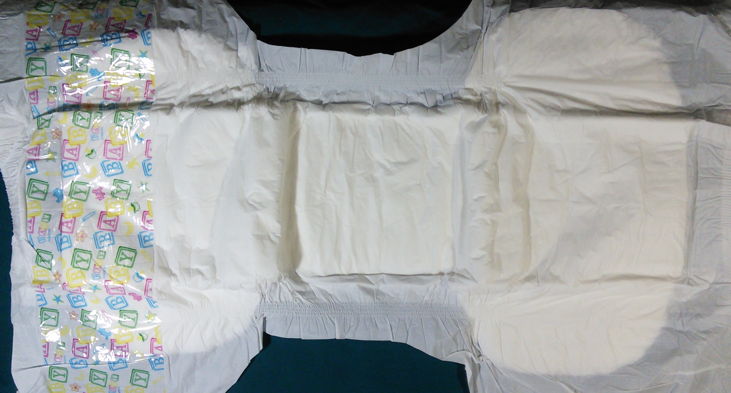 White plastic brief with landing zone pattern of baby blocks spelling “BABY”.