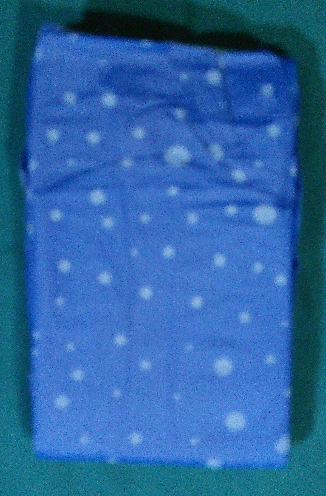 Dark blue brief with light blue polka dots of various sizes.