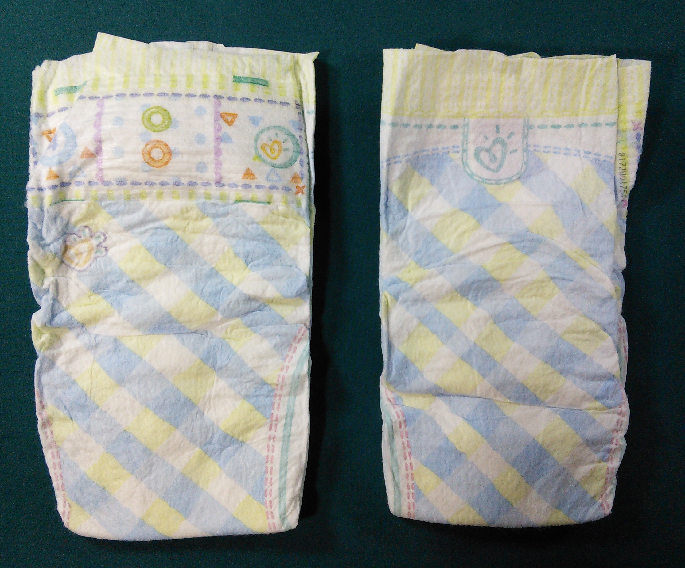 Baby diaper with yellow wetness stripe and small green rectangle below the front waist with “COMFORTS”.