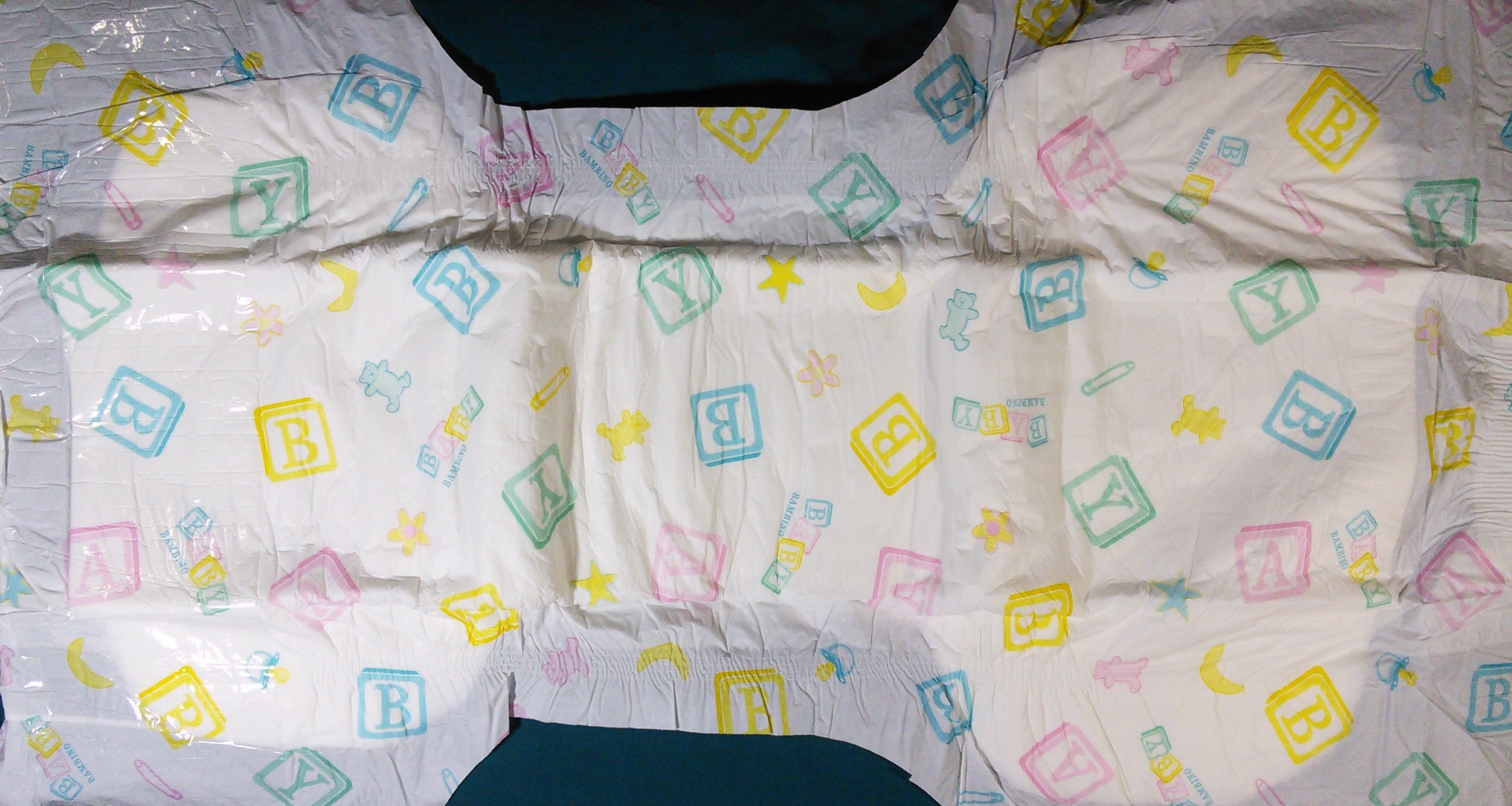 White plastic brief with landing zone pattern of baby blocks spelling “BABY”.