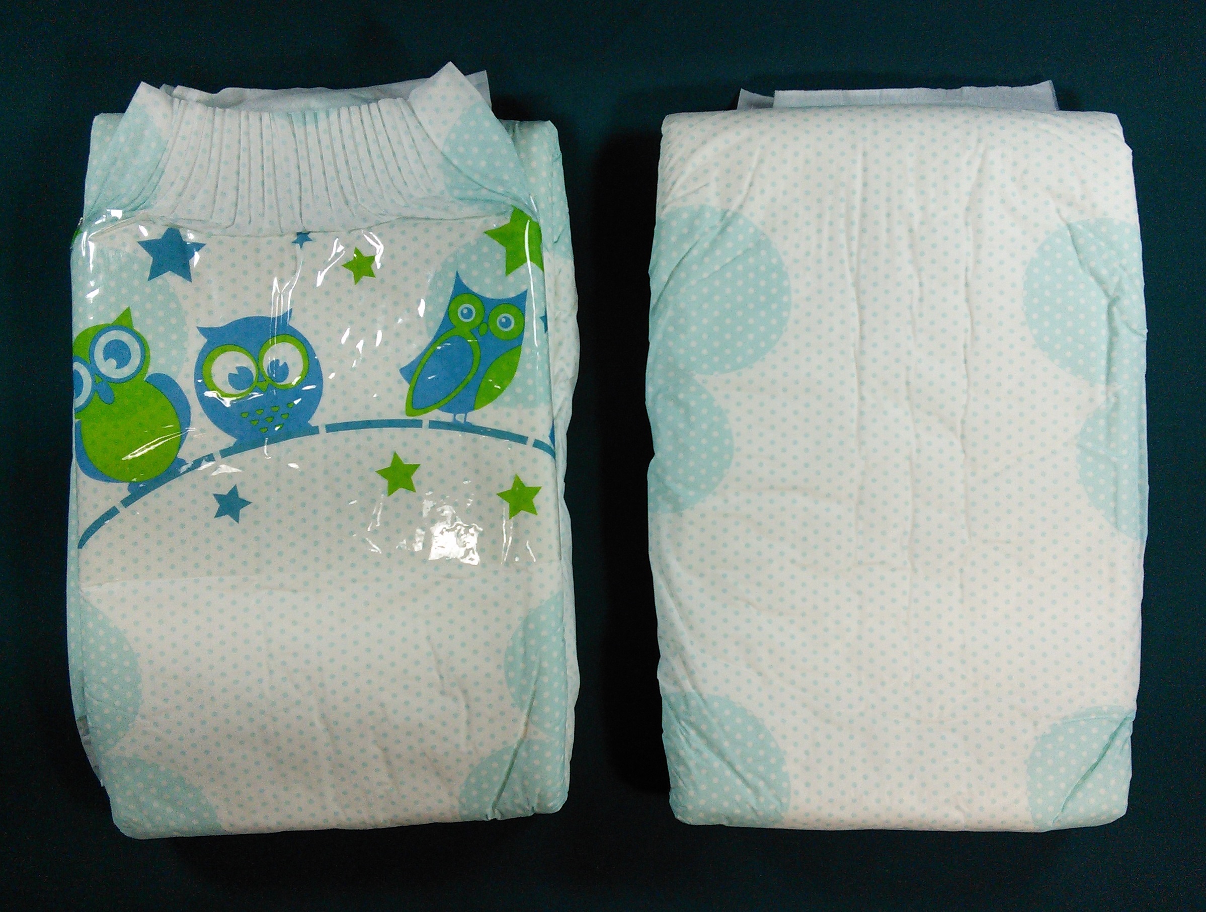 White plastic brief with tiny baby blue polka dots and large baby blue flowers with tiny white polka dots. The landing zone has blue and green owls and blue and green stars and moons. The padding has circular bumps in a hex pattern.