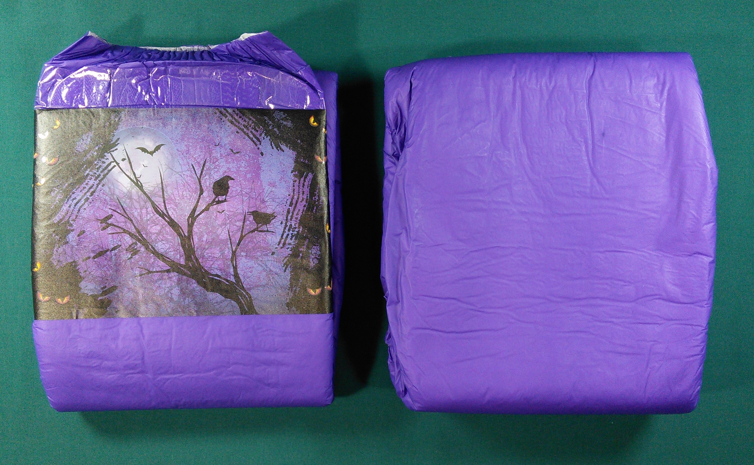Purple plastic brief with a glow-in-the-dark haunted woods scene on the front: bats, ravens, eyes, dead tree, moon.